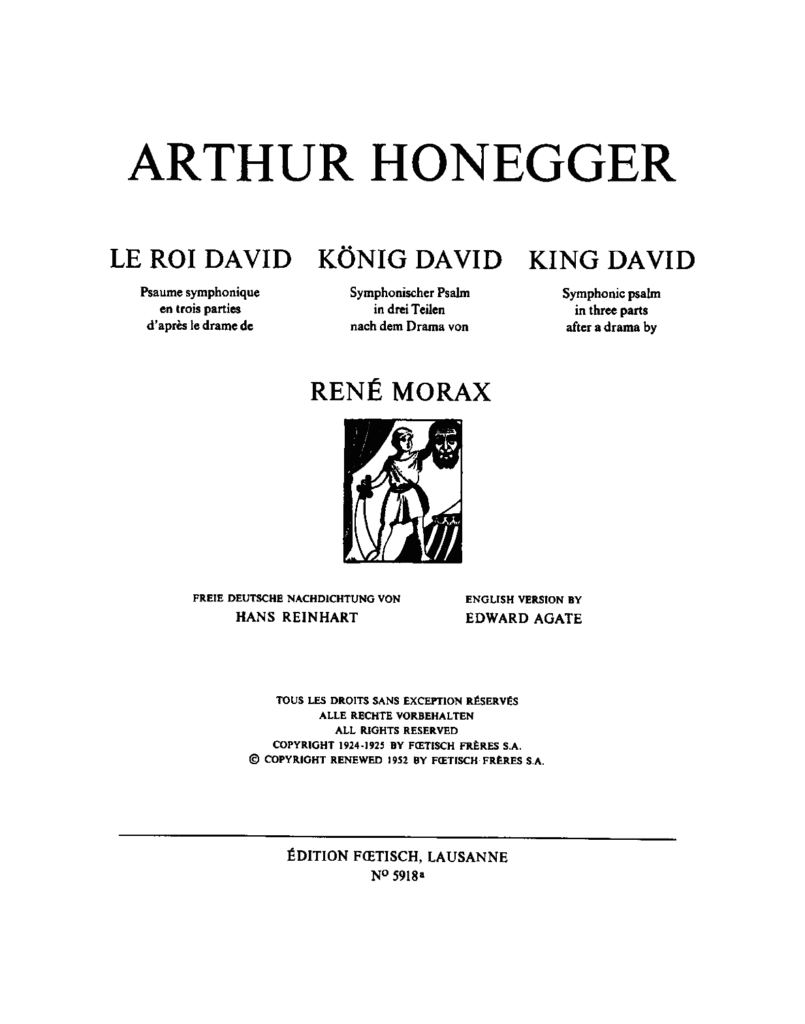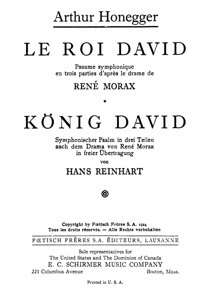 Také Honegger, mající rodinné kořeny v protestantském Švýcarsku, patřil na poválečné scéně ve francouzské metropoli k avantgardě, ostatně značnou popularitu získal v roce 1923 symfonickou skladbou Pacific 231, ztvárňující hudebními prostředky dynamiku jízdy moderní parní lokomotivy. Avšak Honeggerova hudba obecně má v porovnání s díly ostatních členů Pařížské šestky vážnější charakter. Byl silnou individualitou a čím dál víc oceňoval a zdůrazňoval důstojnost, prostotu a vážnost. Je pozoruhodné, jak soustředěnou a střízlivou partituru v Králi Davidovi vytvořil, ačkoli mohl být ovlivněn pozdními romantiky, impresionisty, expresionisty nebo folkloristy, bezstarostností meziválečné zábavné hudby, jazzem, hravým neoklasicismem i novou věcností…