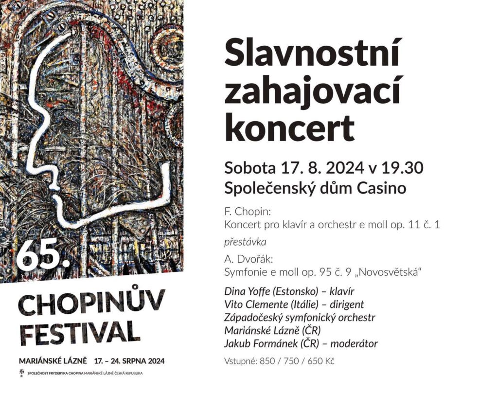 Slavnostní zahajovací koncert se ve Společenském domě Casino koná 17. srpna. Na programu je osvědčený Chopinův Koncert pro klavír a orchestr e moll č. 1, op. 11 a neméně populární a tóninovým určením shodná Symfonie e moll č. 9, op. 95 „Z nového světa“ Antonína Dvořáka. Západočeský symfonický orchestr Mariánské Lázně diriguje italský řídící Vito Clemente, sólistkou je Dina Yoffe z Lotyšska. Koncert disponuje i moderátorem, jímž bude Jakub Formánek.