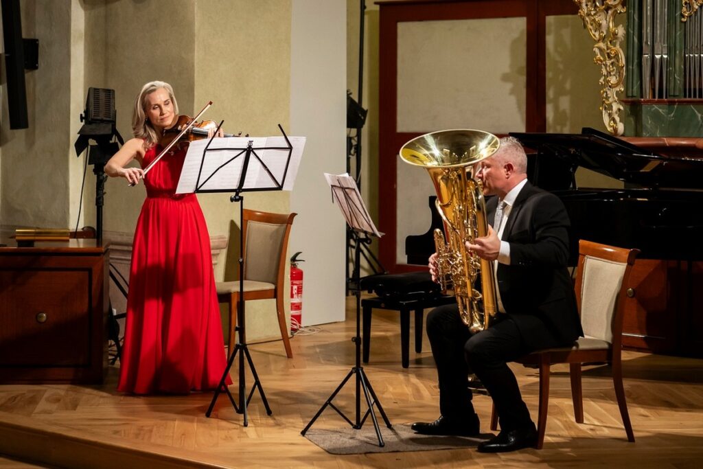 Nevšedním obohacením večera se stalo zapojení „jiného nástroje“. V rámci komorního cyklu letošní sezony Prague Philharmonia, kde byla tématu instrumentů málokdy se nacházejících v sólové roli věnována celá abonentní řada, byla tentokrát jako nápadité zpestření konvenčního schématu ke komornímu koncertu přizvána tuba. Na program se dostala nikoliv náhodou, ale záměrně. Největší orchestrální dechový žesťový nástroj se do společnosti klavírního tria na pódium dostal proto, aby bylo učiněno zadost tématu jinakosti, rovněž ale i proto, aby mohla být ke společnému koncertnímu vystoupení nabídnuta příležitost manželské dvojici hudebníků – houslistce Haně Kubisové Jarošové a jejímu manželovi, tubistovi Janu Jarošovi. Lehké bylo vyzvat je oba ke společnému koncertnímu vystoupení, nelehké však bylo najít pro ně vhodný repertoár. Našla se skladba současného německého skladatele Jörga Dudy, který oba tyto opravdu velmi málo příbuzné nástroje spojil k souhře ve svém dvoudílném Duettu pro housle a tubu op. 5/5 (I. Andante con moto, II. Allegro capriccioso). Z hlediska melodicko-harmonického jde o skladbu tradičního ražení. Zaujme na ní však onen souboj, nebo lépe řečeno dialog dvou značně odlišných světů. Tam, kde tuba svým rozsahem vzhůru končí, tam jsou housle ve spodní poloze, tam, kde housle hrají ve fortissimu, tam je tuba teprve v pianissimu. Podle tohoto klíče tedy duo housle-tuba logiku nemá. Rozumným vysvětlením by však mohlo být to, že se zde vlastně jedná o hudební vyjádření dobře vyváženého, komplementárního manželského dialogu. A že jsme v tomto ohledu blízko pravdě nás mohl utvrdit upřímný manželský polibek na závěr, provázený vskutku zaslouženým potleskem z publika.
