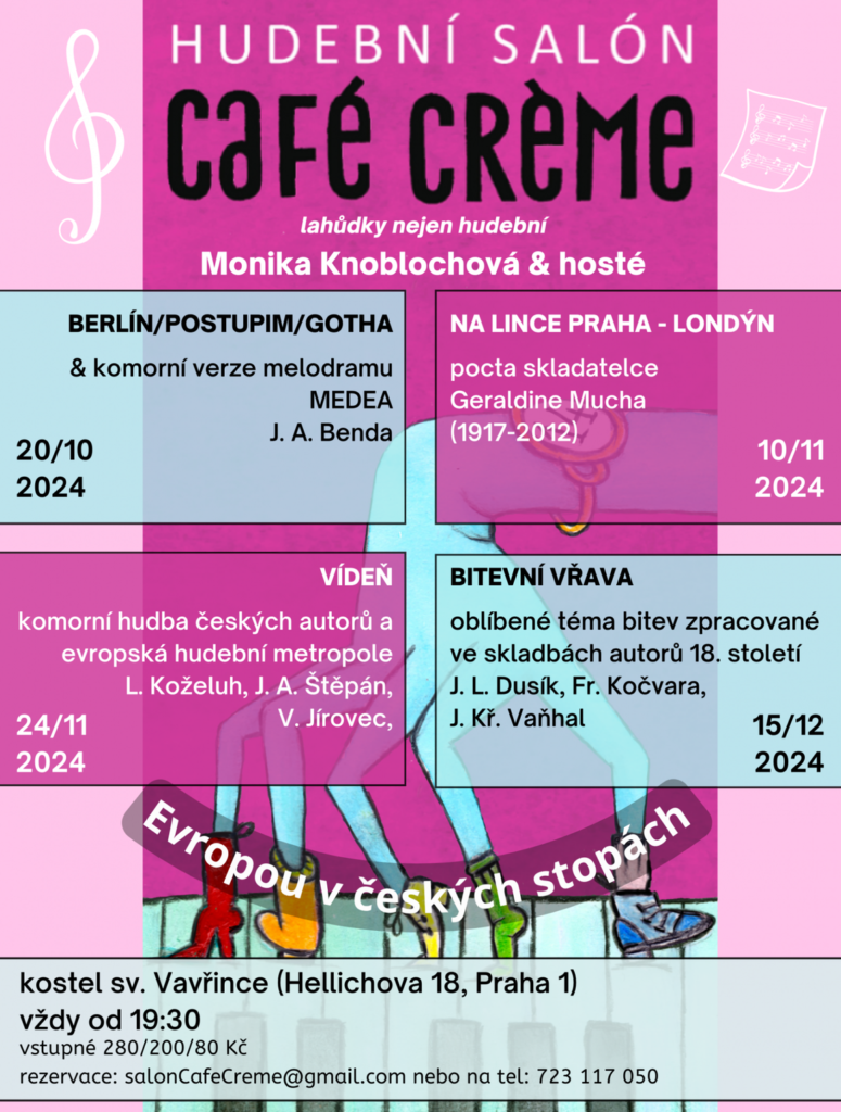 Hudební salón Café crème s podtitulem „lahůdky nejen hudební“ je cyklus čtyř koncertů cembalistky Moniky Knoblochové a jejích hostů. A po každém skutečně následuje malé domácí občerstvení. Podzimní řada večerů pod záštitou Pražského jara začíná 20. října v půl osmé koncertem v sídle festivalu, v kostele sv. Vavřince na Malé Straně.