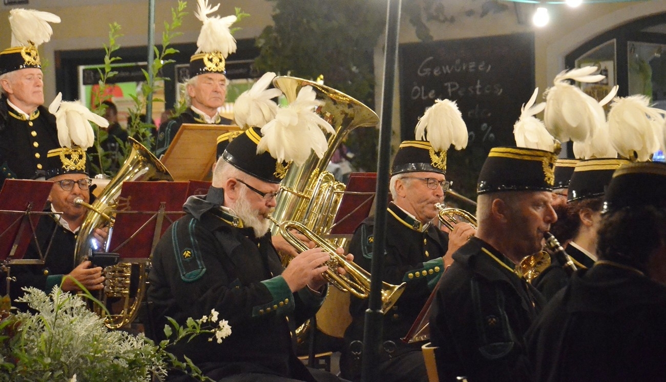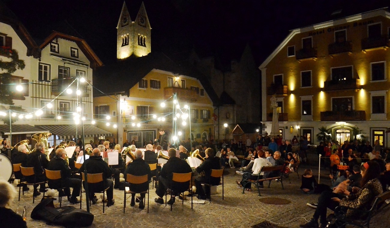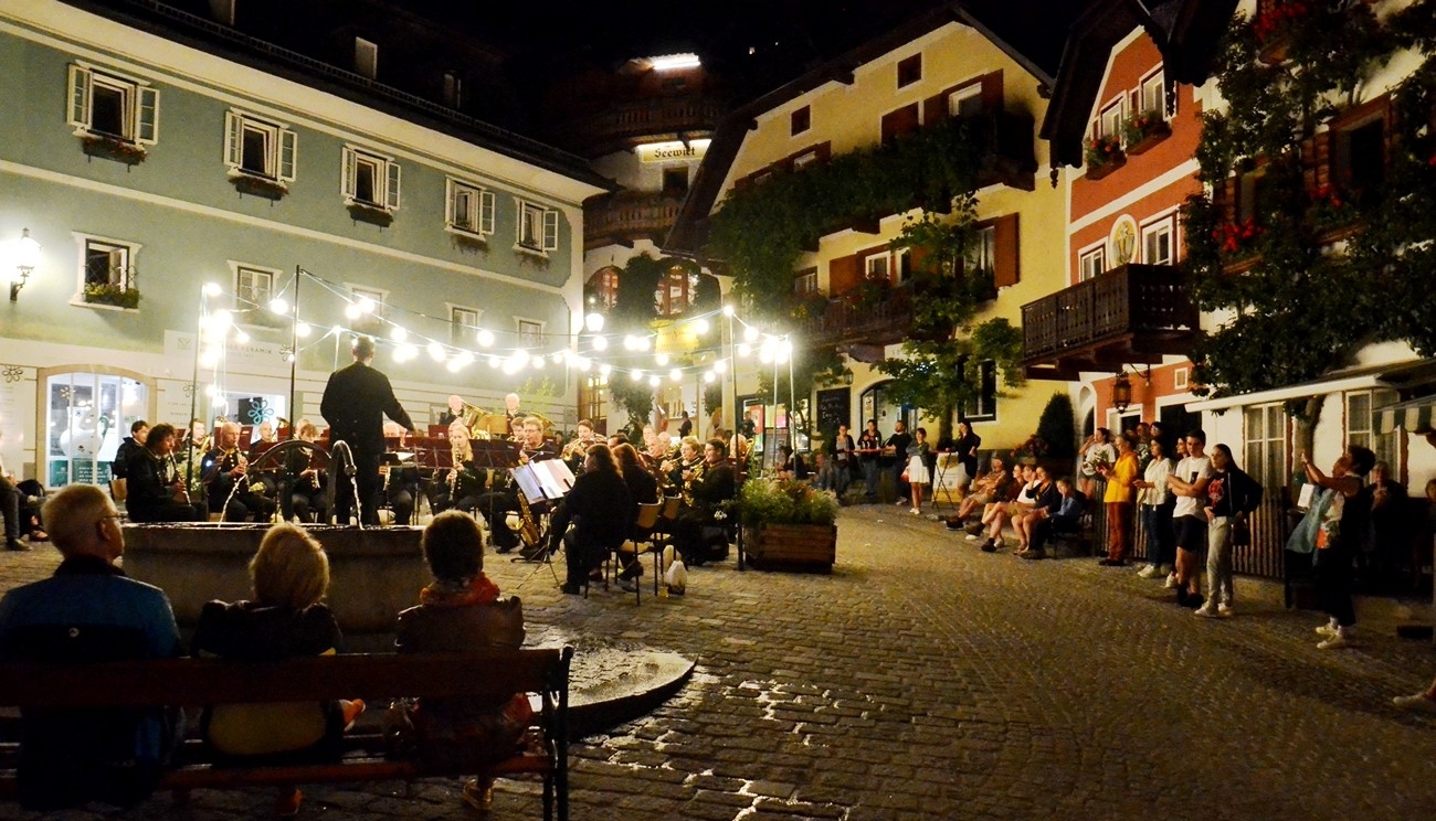 Je devět večer, tma, začal poslední prázdninový víkend a orchestr v hornických uniformách už hodinu naplňuje ohlášený záměr: Platz-Konzert. Open air na náměstí. Všude kolem jsou ve tmě alpské kopce, ale je mimořádně teplo. V noci přijde déšť. Teď je tu ovšem ještě skoro jako někde ve Středomoří. Lidé posedávají a postávají, v rukou víno nebo pivo, a nezvykle teplý vítr čechrá jak vlasy, tak noty na pultech. Závěrečný letní den, jaký se už jen těžko bude letos opakovat, nabízí jako tečku pohodovou sešlost turistů i místních.