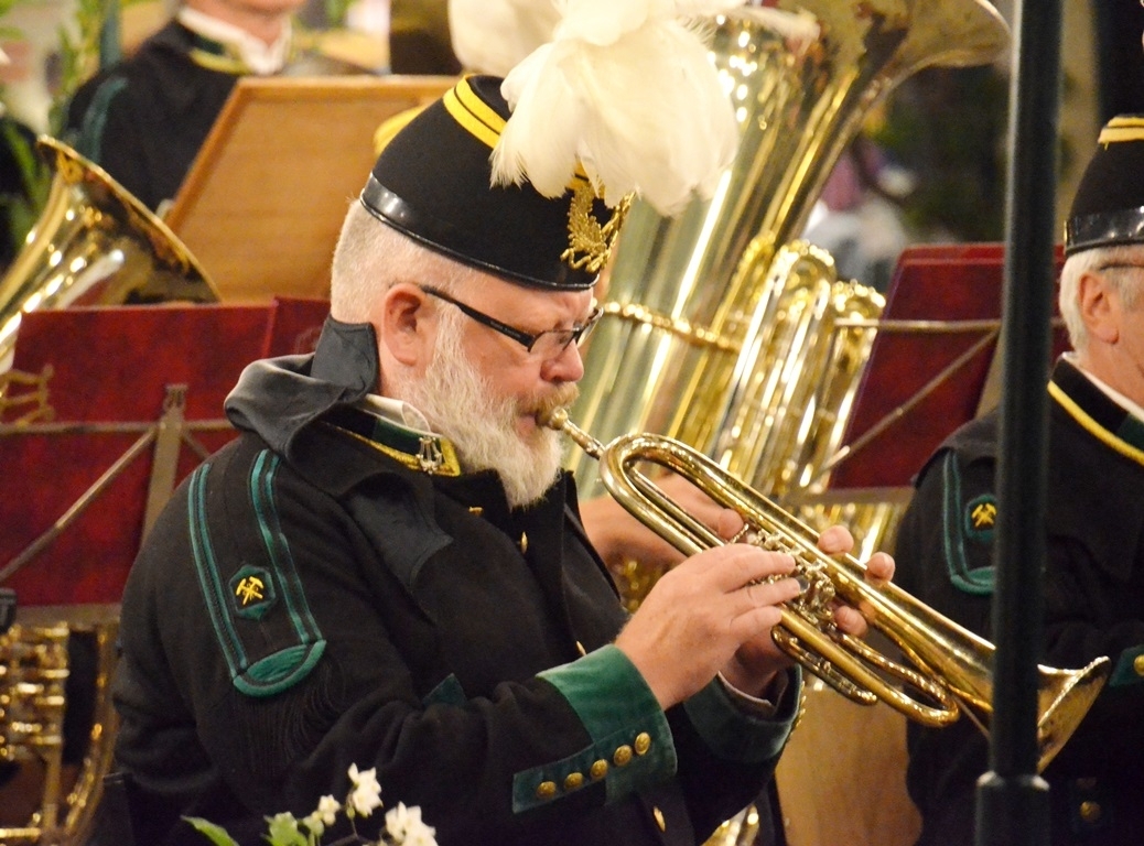 „Muzikanti ke svým tmavým slavnostním hornickým uniformám přidávají čáky s bílými péřovými chocholy, hudba dostává nejvyšší grády…“