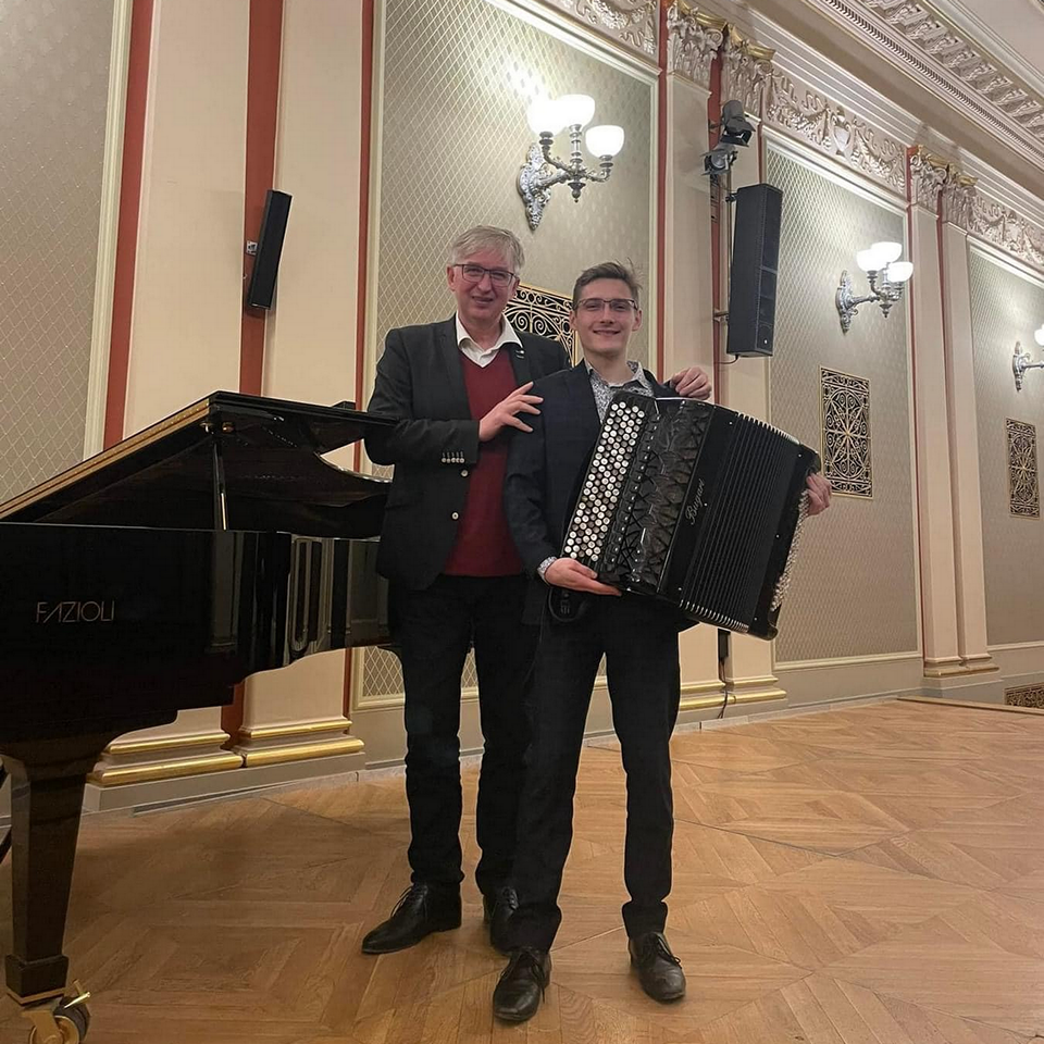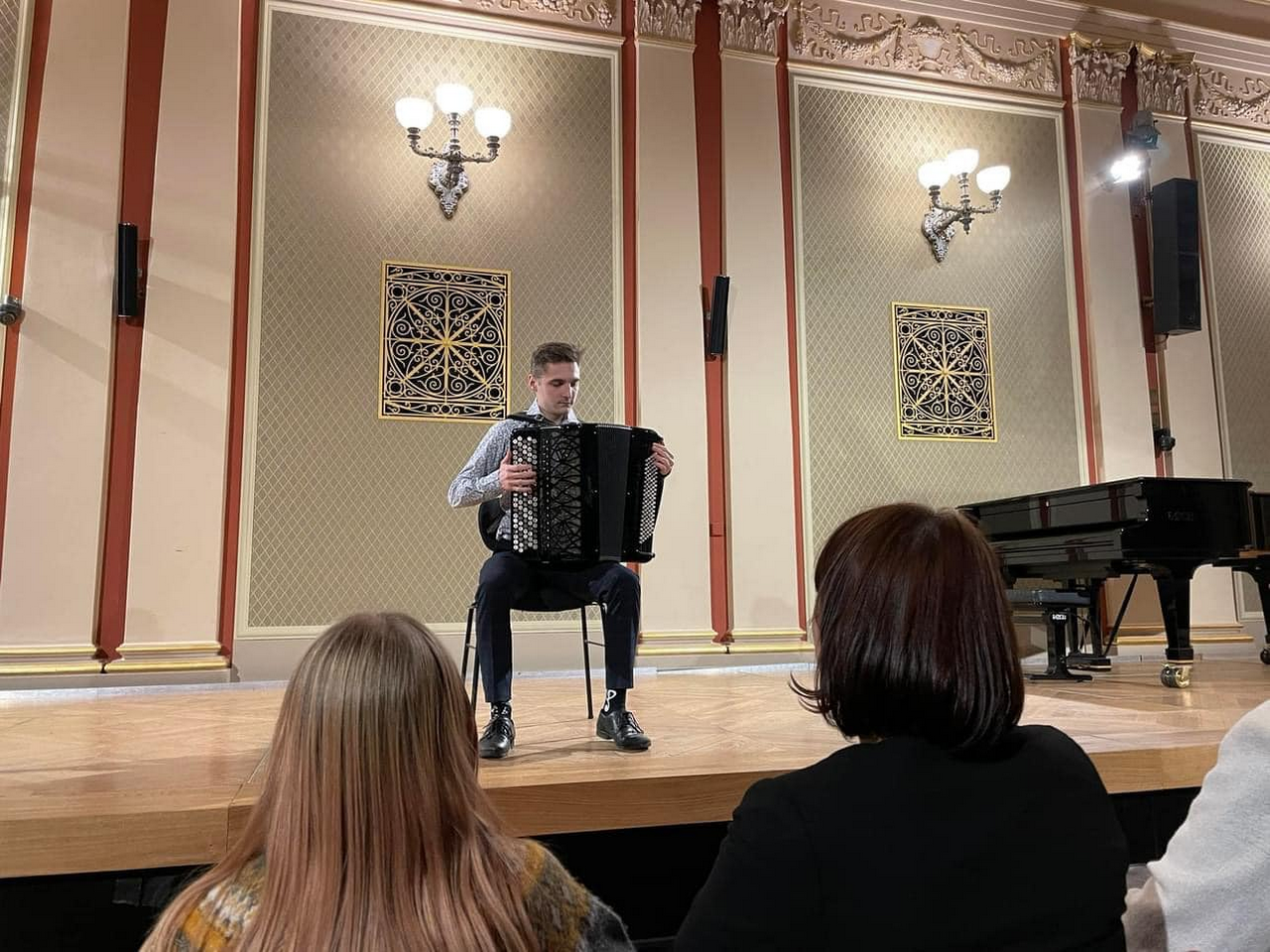 V první polovině podvečera se představil akordeonista Martin Šulc. Je to absolvent Pražské konzervatoře, kde studoval ve třídě Ladislava Horáka. Absolvoval v roce 2023 provedením Koncertu pro akordeon a orchestr Petra Fialy a na svém kontě má již četná přední umístění v mezinárodních soutěžích. Na tomto místě je však třeba připomenout i to, že počátky jeho úspěšné dráhy jsou spojeny se základním uměleckým školstvím. Na ZUŠ v Třeboni byl žákem Lenky Slaninové.
