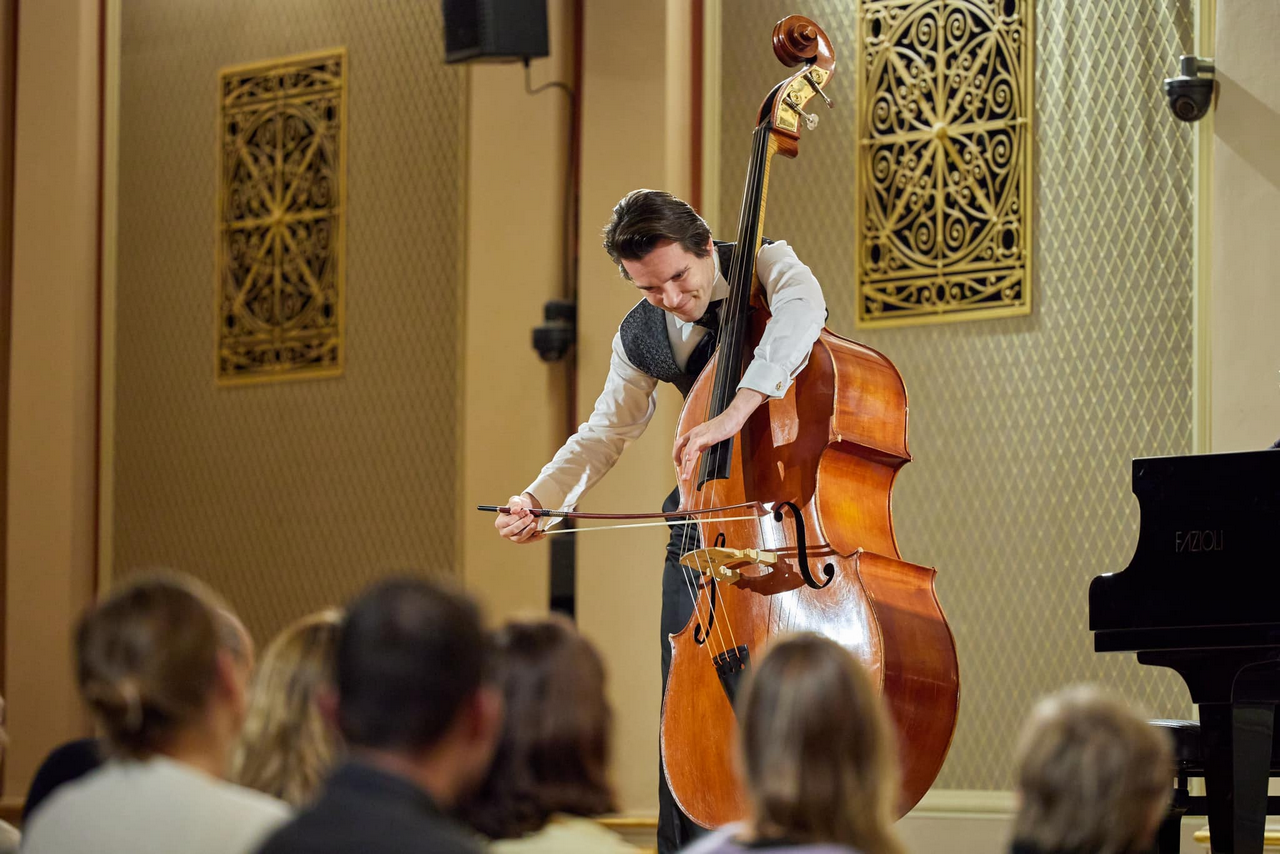 Druhá část koncertu patřila kontrabasu. Je to sice nástroj s bohatou tradicí, až teprve v současné době však proniká na komorní pódia jako svébytný virtuosní element. Indi Stivín je nesporným mistrem svého nástroje, není proto náhodou, že je laureátem nejedné mezinárodní interpretační soutěže. Hraje sebejistě, s obdivuhodnou intonační čistotou a muzikantským zápalem.