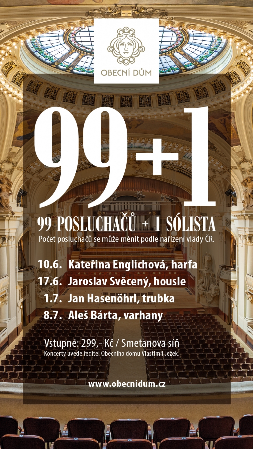 Čtyři koncerty cyklu nazvaného 99+1 přivedou na pódium Smetanovy síně postupně harfistku Kateřinu Englichovou, houslistu Jaroslava Svěceného, trumpetistu Jana Hasenöhrla a varhaníka Aleše Bártu. Do znovuotevřeného pražského Obecního domu mají přilákat publikum poté, co se zmírňují hygienické restrikce spojené s jarní pandemií. Konají se 10. a 17. června a 1. a 8. července, tedy vždy ve středu v 19:09, devět minut po sedmé večer.