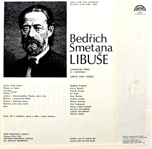 Zároveň si už nemůžeme poslechnout první garnituru sólistů Národního divadla, kteří v tehdejším Krombholcově nastudování excelovali (Miladu Šubrtovou, Martu Krásovou, Václava Bednáře, Zdeňka Otavu a Beno Blachuta). Pouhým svědkem této Krombholcovy divadelní inscenace zůstává v rozhlasovém archivu ukrytý záznam živého provedení v Národním divadle z roku 1955. Tam tehdy ovšem Libuši zpívala skvělá Ludmila Červinková. Vzpomínám, že rozhlas ve svém vysílání v 50. letech tuto strhující nahrávku s Červinkovou zásadně upřednostňoval před oním starším snímkem Klímovým s Podvalovou.