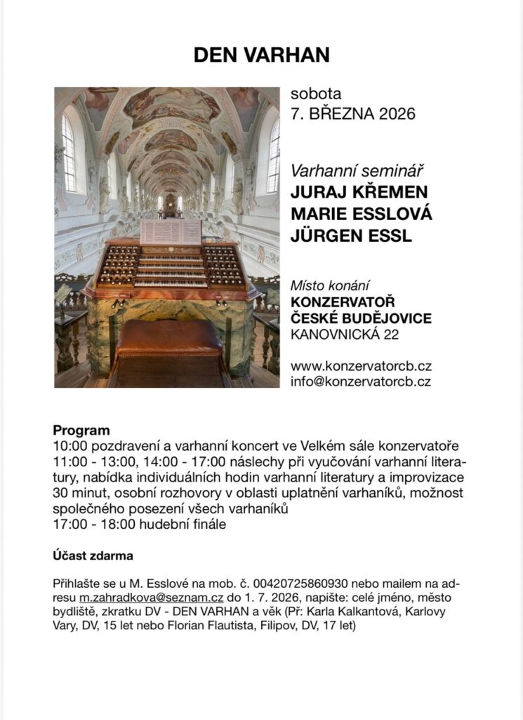 Konzervatoř v Českých Budějovicích otevře začátkem března své prostory zájemcům o varhanní hudbu. Den varhan, který se uskuteční 7. března od deseti hodin, nabídne celodenní program zaměřený na výuku, interpretaci i improvizaci. Cílem akce je přiblížit studentům i širší odborné veřejnosti možnosti studia a praktické práce s varhanami v různých stylových i zvukových podobách. Součástí programu budou náslechy při výuce, individuální lekce varhanní literatury a improvizace a možnost seznámit se se třemi odlišnými nástroji, které se liší jak konstrukcí, tak zvukovým charakterem. Organizátoři tak chtějí nabídnout nejen teoretické informace, ale především přímou zkušenost s nástrojem.
