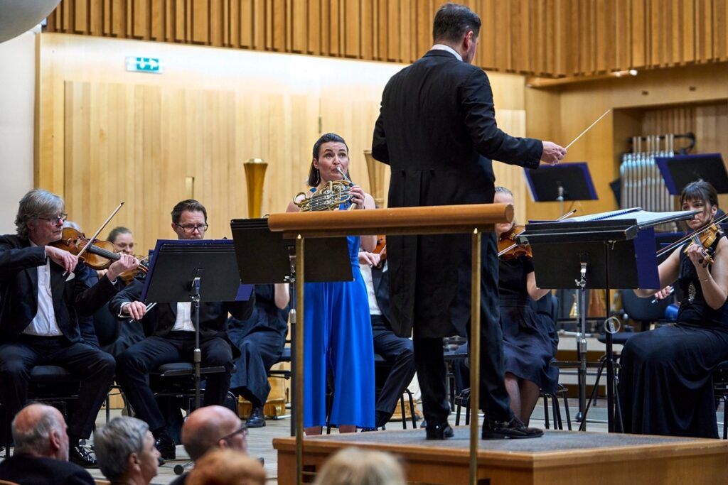 Jak již z názvu skladby vyplývá, jedná se o záležitost s neobvyklým obsazením. Britten zde využívá lesní roh jako bezeslovného komentátora textu zpívaného tenorem. Serenáda čítá celkem osm částí, a to včetně úvodního hornového prologu a protilehlého epilogu. Bravurní sólovým prologem zahájila Kateřina Javůrková. Hráčka působící mimo jiné v České filharmonii okouzlila všechny přítomné jak bravurní technikou, tak neobyčejně procítěnou interpretací.