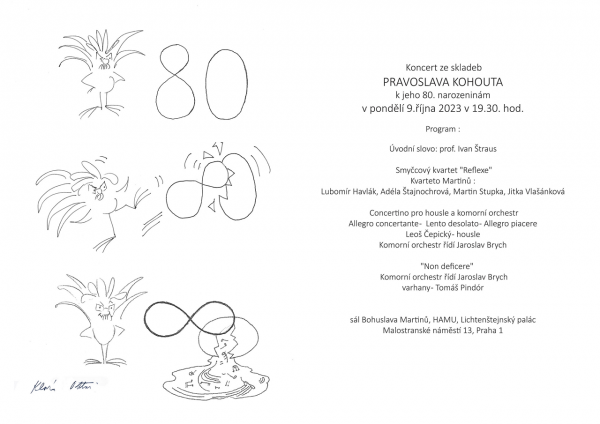 Předčasně své osmdesáté narozeniny oslaví houslista, pedagog a publicista Pravoslav Kohout. V Sále Martinů na pražské HAMU 9. října zazní výběr z Kohoutových skladeb, protože činný je též jako autor. Trojici kompozic ztvární Kvarteto Martinů, houslista Leoš Čepický, varhaník Tomáš Pindór a komorní orchestr pod vedením Jaroslava Brycha. Zazní skladby Reflexe (smyčcový kvartet), Concertino pro housle a komorní orchestr a Non deficere. Koncert v půl osmé zahájí svým úvodním slovem prof. Ivan Štraus.