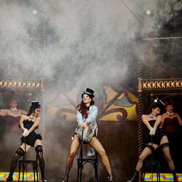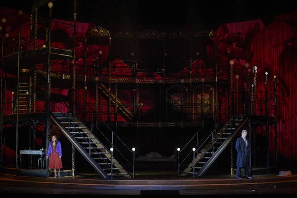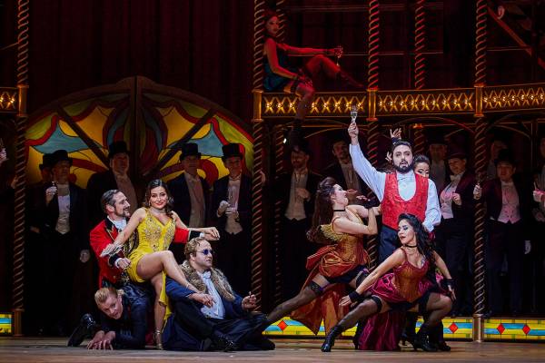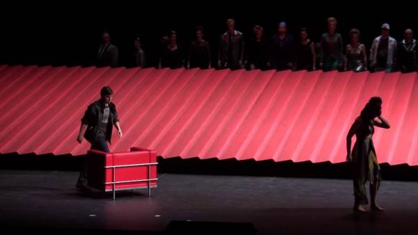I když – možná naštěstí – ne na sto procent. Už sám úvod prvního dějství totiž působí doslova opulentně. Zadní plán jeviště je zastavěn třípodlažní půlkruhovou konstrukcí, evokující arénu či amfiteátr. Právě tudy se vchází do nočního podniku jak vystřiženého z filmu Baze Luhrmanna Moulin Rouge (2001). Pestrá společnost pánů ve fracích a cylindrech a lehkých dívek v odění z přelomu devatenáctého a dvacátého století vzývá svou hvězdu: krasavici Violettu ve vyzývavých žlutých šatech, která se mezi ně efektně snese od stropu na houpačce. Z uniformní masy mužů se brzy vydělí mladík Alfredo, který rozvernou kurtizánu zaujme už během společného přípitku. Jejich další sbližování pak probíhá při proměně scény, která je stejně působivá jako překvapivá. Ukáže se totiž, že arénu tvoří vnější a vnitřní plášť, a oba tyto komponenty se rozjedou každý po své točně opačným směrem. Z původního půlkruhu se tak stane uzavřená, avšak dokonale průhledná stavba. Nutno tedy přiznat, že na rozdíl od Homokiho vlnitého plechu je tohle přece jen trochu honosnější podívaná, osvětlená navíc množstvím světel a nejrůznějších girland. Úžasné a fascinující, řeknete si, a pokud jste zvyklí si během představení „režírovat pro sebe“, možná vás napadne, že tuhle grandiózní arénu asi brzy zaplní publikum, které bude celou dobu sledovat Violettin a Alfredův příběh a nedopřeje mu ani náznak soukromí a intimity… Jenže režisérkou je tu stále ještě Barbora Horáková Joly a ta má trochu jiné plány. Po Alfredově odchodu se konstrukce opět vrátí do původní podoby, světla pohasnou, hosté se rozloučí a v podniku zasednou zaměstnanci a zaměstnankyně ke stolkům, u nichž klábosí a odpočívají. Kdosi přinese Violettě mikrofon, aby si zazpívala árii È strano… Sempre libera, kterou si „po práci“ trochu sebelítostivě zpívá možná každý večer. Její cyničtí společníci už jsou na to nejspíš zvyklí… Dnes je ale všechno jinak – k dívce se tentokrát připojí zamilovaný Alfredo, oblečený teď už do současného trička, bundy a jeansů, a je jasné, že mezi oběma vzplanul cit, pro nějž jsou připravení obětovat cokoliv.