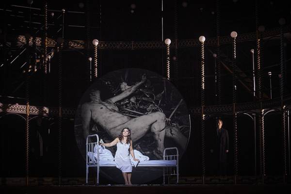 Arénu neopustí oba milenci ani v první scéně druhého dějství, které by se mělo odehrávat na venkově. Zde je jim dopřána postel, pod níž leží náš starý známý trpaslík, přestrojený za smrtku, ale oba zamilovaní lidé o něm zjevně nevědí, nebo si jeho přítomnost nepřipouštějí. Raději pořádají polštářové bitvy, které nezkalí ani zjištění, že polštáře jsou místo peří naplněné uschlým listím. Přiznaný luhrmannovský manýrismus z prvního dějství tak nahrazuje jakýsi laciný „surrealismus pro každého“. Tady začíná podle mého názoru původně zajímavě koncipovaná inscenace trochu drhnout, aby bylo bohužel brzy ještě hůř. Když po Alfedově odjezdu navštěvuje Violettu starý Germont – distingovaný postarší muž v dobře padnoucím obleku s kravatou – nenapadne režisérku nic víc než přidělit mu jako doprovod dceru, oblečenou pro jistotu rovnou ve svatebních šatech… Společná scéna Germont–Violetta proběhne značně staticky a nenápaditě, přičemž nijak oslnivým nápadem není ani symbolický „příjezd“ skupiny prostitutek na vnitřním plášti konstrukce. Děvčata patrně mají za úkol upozornit diváky, že návrat Violetty k původnímu zaměstnání se blíží.