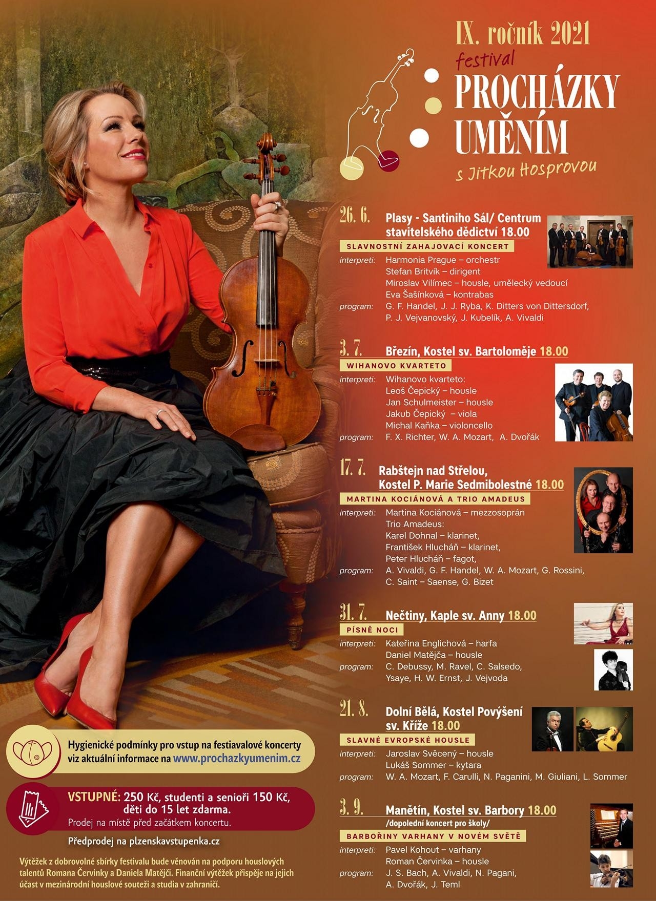Po náročném roce přišli pořadatelé i letos s letním hudebním programem devátého ročníku festivalu Procházky uměním. Původní dramaturgie prošla kompletní rekonstrukcí a ta současná vychází z omezených možností pro pořádání kulturních akcí, a také z časových možností umělců a partnerů projektu. Vzhledem k minimálnímu prostoru na přípravu textů poprvé na festivalu nevystoupí herecké osobnosti a letošní ročník Procházek uměním bude přednostně věnován hudbě. Pozvání přijali sólisté i komorní soubory. Po sobotním zahájení přijede 3. července Wihanovo kvarteto a na dalších koncertech vystoupí ještě Martina Kociánová a dechové trio Amadeus, Kateřina Englichová, Jaroslav Svěcený a Lukáš Sommer nebo Pavel Kohout.