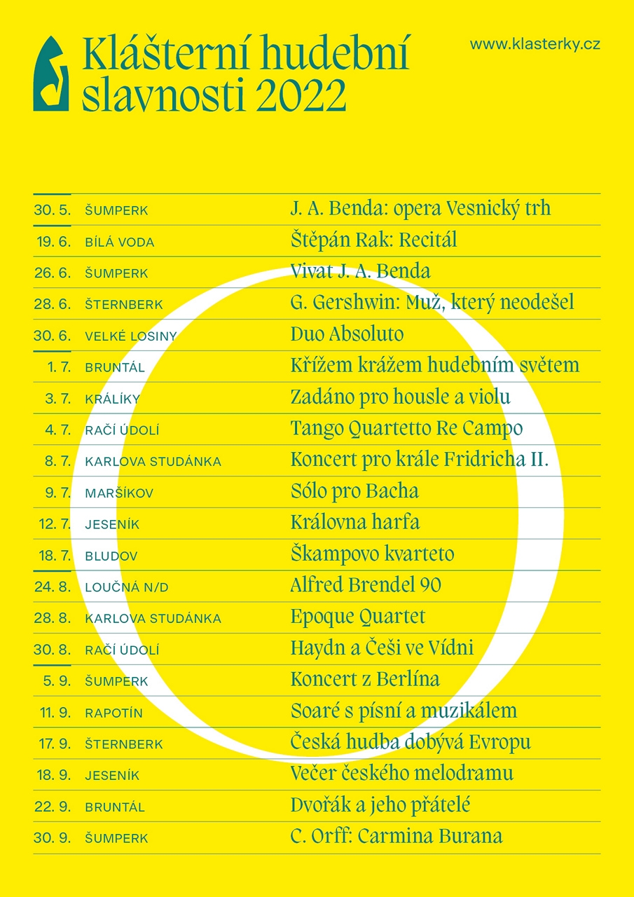 Šestnáctý ročník Klášterních hudebních slavností nese podtitul Odvaha. Od května do září uvede festival celkem jednadvacet koncertů českých i zahraničních interpretů na čtrnácti místech Jeseníků. Dramaturgie festivalu se promítne v několika rovinách. Světovou premiérou pořadatelé připomenou tři sta let od narození českého skladatele Jiřího Antonína Bendy a vzpomenou také na výročí čtyřiceti let od úmrtí Carla Orffa.