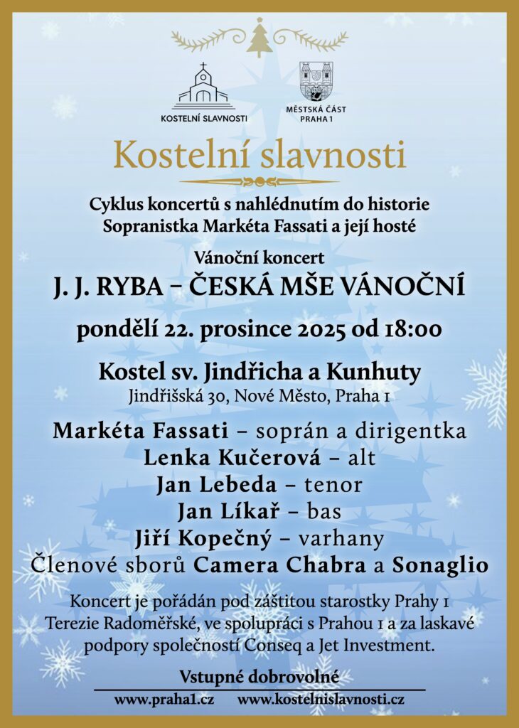 Projekt Kostelní slavnosti vznikl v roce 2020 jako reakce na omezení kulturního života během pandemie, kdy hudba zaznívala v prázdných kostelech a nabízela posluchačům duchovní povzbuzení. Od té doby se vypracoval v pravidelný koncertní cyklus propojující hudbu s historií a geniem loci významných sakrálních prostor v katastru převážně prvního pražského obvodu. Na koncertě zařazeném těsně před vánočními svátky vystoupí sopranistka Markéta Fassati, která se zároveň ujme dirigentské role. Na pódiu ji doprovodí altistka Lenka Kučerová, tenorista Jan Lebeda, basista Jan Líkař, k varhanám usedne Jiří Kopečný. Sborové party provedou Camera Chabra a Sonaglio. Program koncertu tvoří tradiční Česká mše vánoční Jakuba Jana Ryby.