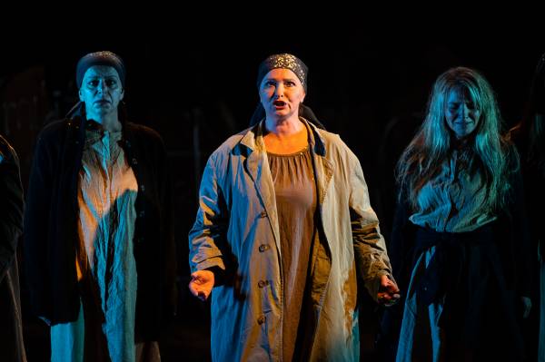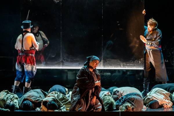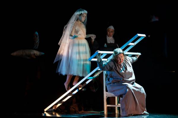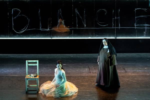Na jevišti usedají, jak to bylo zvykem, diváci popravy. A jeptišky, jedna po druhé, za zpěvu nábožné písně, jdou pod gilotinu. Její opakovaný svist, integrovaný do naléhavě emotivní hudby, je v operním repertoáru stejně jedinečný, jako nezapomenutelný. Různé inscenace řeší tuto scénu různě, třeba i odchodem za horizont. Linda Hejlová Keprtová našla způsob na hraně realismu a stylizace: každá z popravených strne v nějaké pozici, jako ve výrazovém tanci. K zemi se sesunou až najednou, při posledních tónech opery.