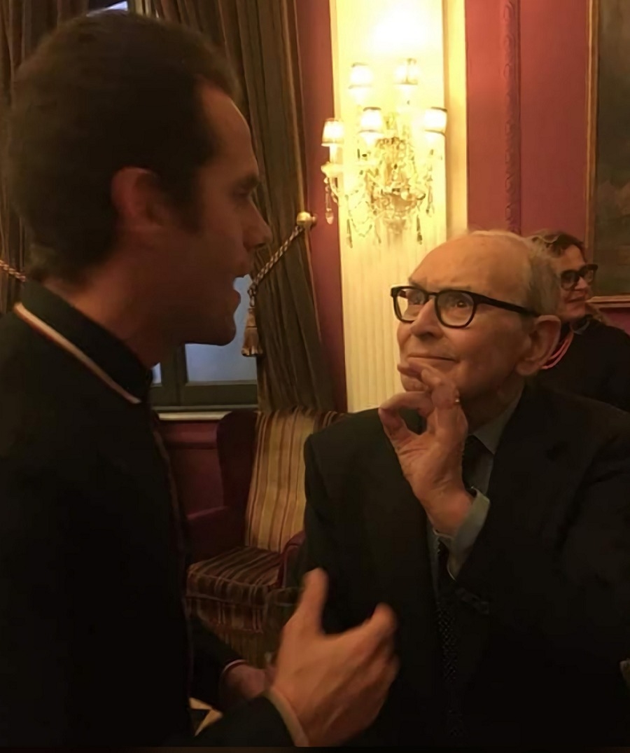 Přicházíme už do salonku určeného pro uzavřenou společnost soutěže. Tam, v počtu necelých patnácti lidí máme možnost pobýt několik hodin po bohu pana Morriconeho a jeho paní. Využívám prvních pár minut k hovoru a vedu anglicky monolog o tom, jaké jeho partitury mám rád a jaké finesy mě v jeho hudbě baví. Laskavě poslouchá, pak se usměje a pronese: „Parlo ooonly italiaano.“ Naštěstí je poblíž paní Travia a ta ochotně v rozhovoru pokračuje. V kostech cítím, že hovoru o hudbě už má Maestro ten den plné zuby, a tak hovor neobratně stáčím k vínu a kávě. Náhle se plamínek v jeho očích zažehne. Padají slova jako „furioso“, „grande“ a dostává se nám takřka degustační přednášky.