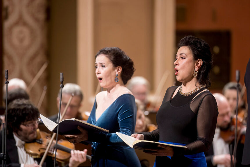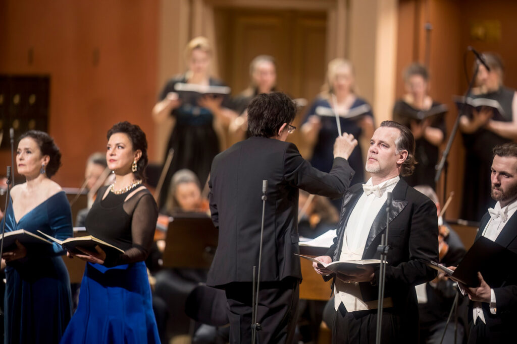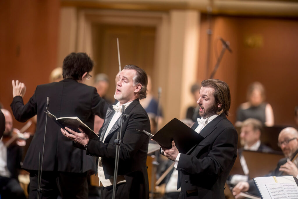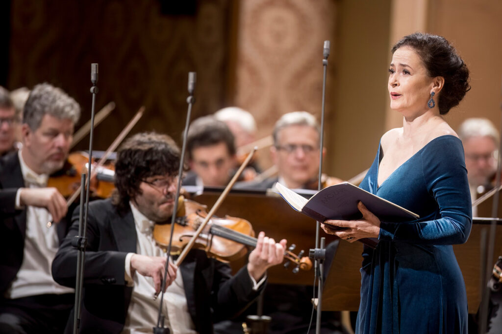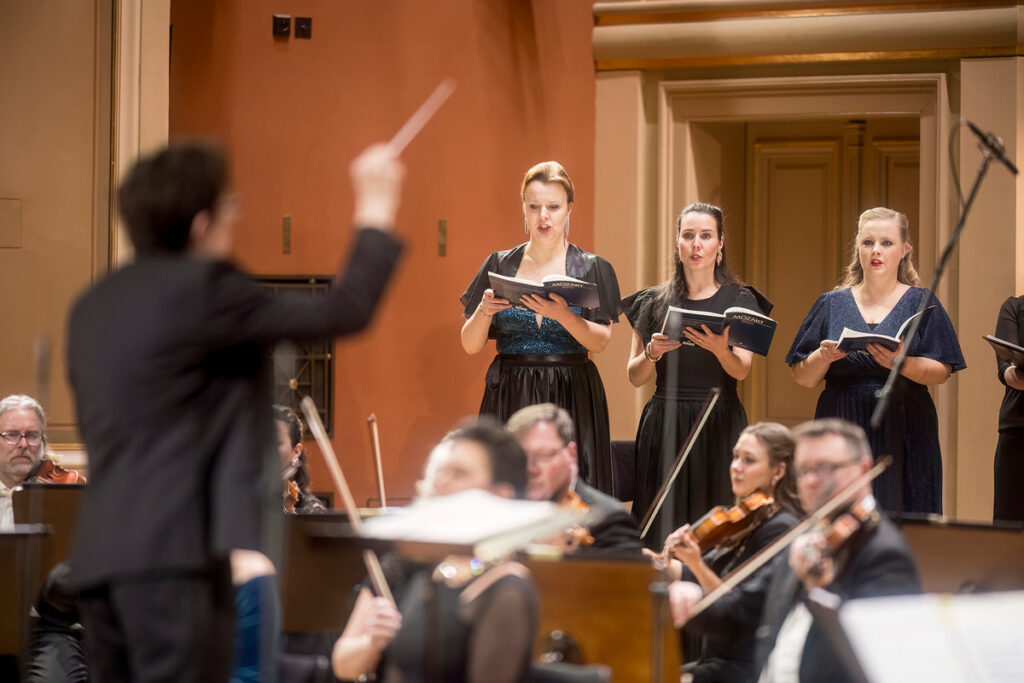 Velkou mši c moll po přestávce přišlo zpívat Collegium Vocale 1704, tedy soubor, který Václav Luks založil jako sestru instrumentálního Collegia 1704. Nakráčeli také sólisté, sopranistky Simona Šaturová a Sophie Harmsen – na těch produkce stojí z důvodu jejich klíčových virtuózních vstupů – a tenorista Václav Čížek s barytonistou Romanem Hozou zpívajícím basovou linku. Doplňme, že druhé sopránové partie se původně měla zhostit mezzosopranistka Štěpánka Pučálková, ale musela na poslední chvíli odříct.