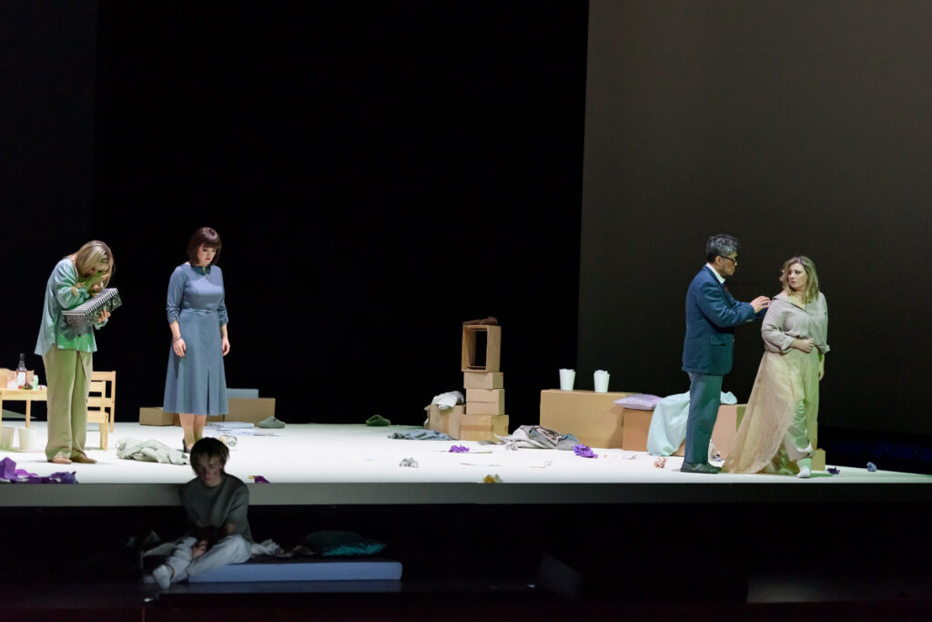 Německá režisérka Isabel Ostermann pojala populární dílo bez vymezení času, odmítá konkrétněji určit dobu děje. Chce příběh vyprávět z perspektivy titulní role Cio-Cio-San, japonskou exotiku odsunout, údajně coby klišé, čímž se ovšem Pucciniho hudba se všemi důslednými a perfektně propracovanými leitmotivy ocitá trochu ve vzduchoprázdnu. Na jevišti se nám objeví syn Butterfly, ovšem 14letý. Mezera tří let mezi dějstvími, vytčená libretem (Pinkerton má být v Americe tři roky), je podivuhodná – vždyť Cio-Cio-San bylo při svatbě 15 let, jak sama v textu oznamuje. Tento syn – již v pubertálních letech – ve finále odejme matce nůž, zabrání jí v sebevraždě, hlavní postava je tak odsouzena žít dál v obrovském životním traumatu.