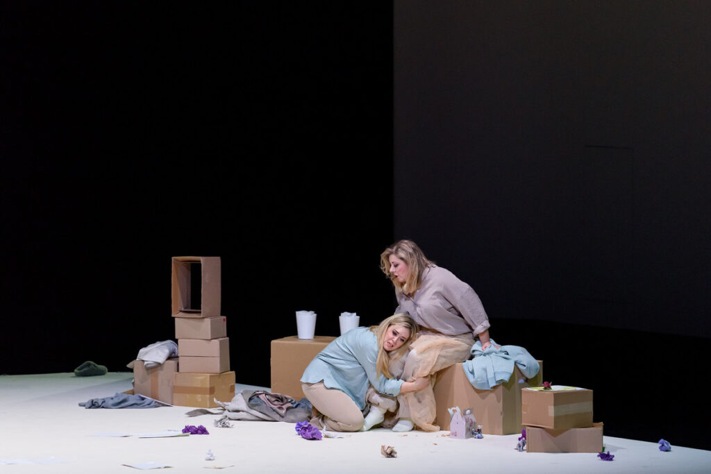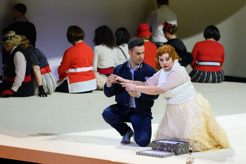 Zhlédnul jsem druhé pěvecké obsazení na první repríze 12. prosince, složené výhradně ze sólistů operního ansámblu v Linci, na premiéře dostali naopak přednost dva hosté v hlavních rolích, de facto jediní hostující pěvci v inscenaci (Joanna Zawartko a Carlos Cardoso). Na první repríze účinkovali domácí sólisté – sopranistka Carina Tybjerg Madsen a slovinský tenorista Matjaž Stopinšek, angažován v Linci v sezóně 2020/21. Oba jsou lyrické hlasy, u nichž zřetelně vyniká kultivovaně tvořená střední a vysoká hlasová poloha, měkce, plasticky vystavěné frázování i schopnost dynamiky v projevu. Carina Tybjerg Madsen vládne příjemně znějícím lyrickým, lehkým sopránem s příjemným témbrem, kulatě a nosně znějícími vyššími polohami hlasu. Výborně jí vyzněla slavná árie Un bel dì vedremo ve druhém dějství s pěkně vybudovanou tektonikou k přesvědčivému vrcholu na vysokém bé, Pucciniho zásadní „hit“ celého díla.