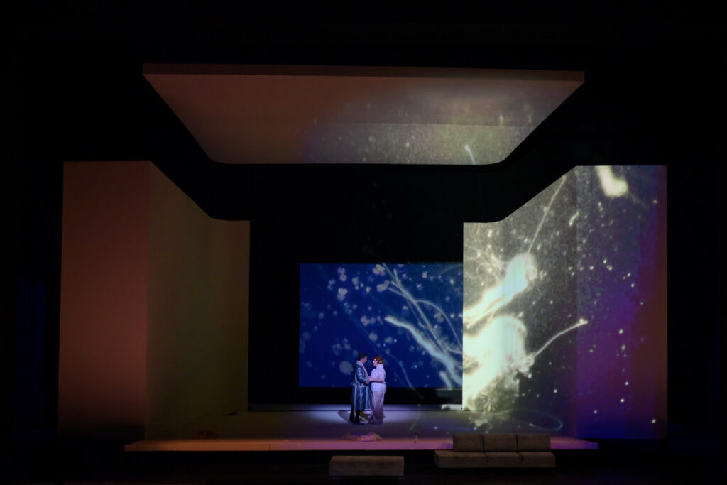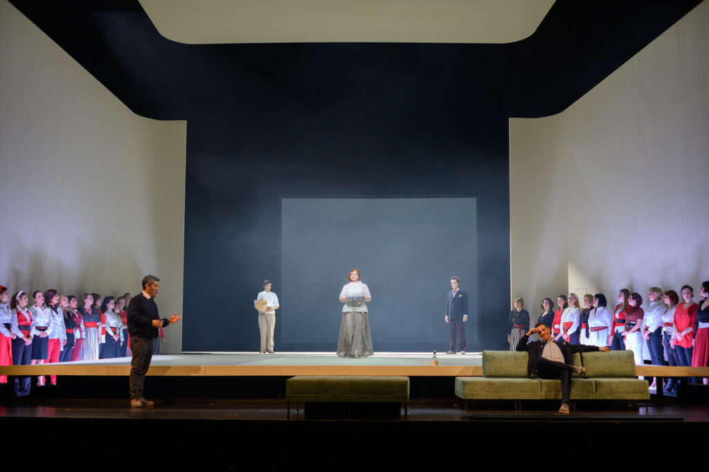 Scéna Sabine Mader nám představuje jeviště v minimalistické koncepci, prakticky holé, s bílými stěnami, inspirace japonskou exotikou vůbec žádná, zřetelně cílená. Scénografie vždy úzce spolupracuje s režisérem, to ani jinak nejde. Video na pozadí ukazuje mořské vlny, což je dobrý leitmotiv, ovšem ve velkém milostném duetu vidíme medúzy, v době slavného orchestrálního intermezza se zde myjí ruce a nohy. To je orchestrem skutečně nádherně zahrané, tak vnímám video v daný moment jen matně, spíše jako zbytečné.