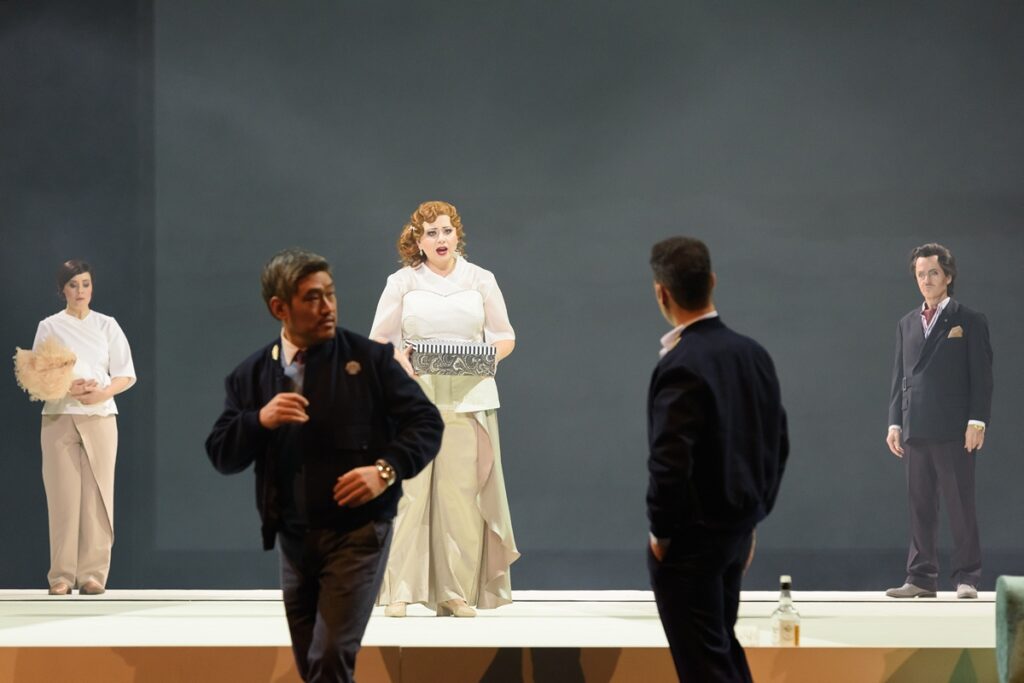 Hlavní dvojici v opeře doplňuje barytonová postava konzula Sharplesse, Puccinim velmi pěkně polohově posazená, vděčná, herecky reprezentativní role. Adam Kim je výtečný barytonista, přivedl ho do Lince nový šéf Markus Poschner v roce 2017 a debutoval skvěle ve Straussově díle Žena beze stínu jako barvíř Barak. Nikdy nezapomenu na tento výrazný výkon. Režie v Butterfly ovšem konzula představuje naprosto netypicky, s přehnanými vráskami, nedbale oblečeného. Je zajímavé, jak to ochudí obvykle vnímanou atraktivitu této partie. Adam Kim ji zvládl pěvecky suverénně, zvláště ve vyšších polohách a v dynamických odstínech. Jeho hereckou kreaci ovlivnilo režijní pojetí.