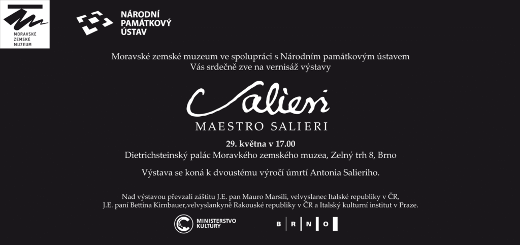 Kapelník císařského dvora ve Vídni, hudební skladatel, pedagog a teoretik Antonio Salieri zesnul 7. května před dvěma sty lety. Oddělení dějin hudby Moravského zemského muzea ve spolupráci s Národním památkovým ústavem u této příležitosti připravilo výstavu, která si klade za cíl představit prostřednictvím zachovaných dokumentů a svědectví současníků tuto rakouskou hudební osobnost blíže představit a očistit ji od fám týkající se jeho podílu na smrti Wolfganga Amadea Mozarta a celkové druhořadosti jeho tvorby.