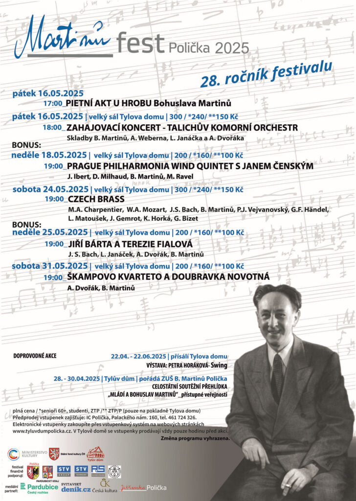 Tradiční festival zasazený do města na českomoravském pomezí předznamenala v závěru dubna celostátní soutěžní přehlídka spolupořádaná s tamní základní uměleckou školou Mládí a Bohuslav Martinů, o jejíž výsledcích portál KlasikaPlus.cz informoval ZDE. Od 16. do 31. května soutěž vystřídá hudební přehlídka rozšířená o úvodní pietní akt u hrobu Bohuslava Martinů a doprovodnou výstavu v přísálí Tylova domu z děl Petry Horákové s titulem Swing, která bude přístupná až do 22. června.