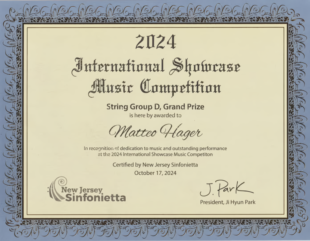 Jednadvacetiletý houslista Matteo Hager uspěl na International Showcase Music Competition v Hamburku. Na soutěži pořádané orchestrem New Jersey Sinfonietta získal v kategorii hráčů na strunné nástroje ve věku od devatenácti do pětadvaceti let hlavní cenu.