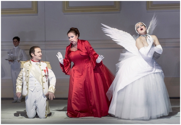 Největší průšvih je ovšem scéna a kostýmy Aleše Valáška. Scéna byla celá v bílém, bílém, ještě jednou v bílém. Kostýmy byly v bílém, bílém, ještě jednou v bílém, aspoň kombinované s pastelovanými barvami. Pouze druhé jednání zezelenalo, kostýmy odpovídaly barvou hráčskému stolku a kulečníkovému stolu, i když vše ostatní bylo opět bílé, zoufale bílé. Včetně mužských protagonistů, ti se bílé nezbavili.