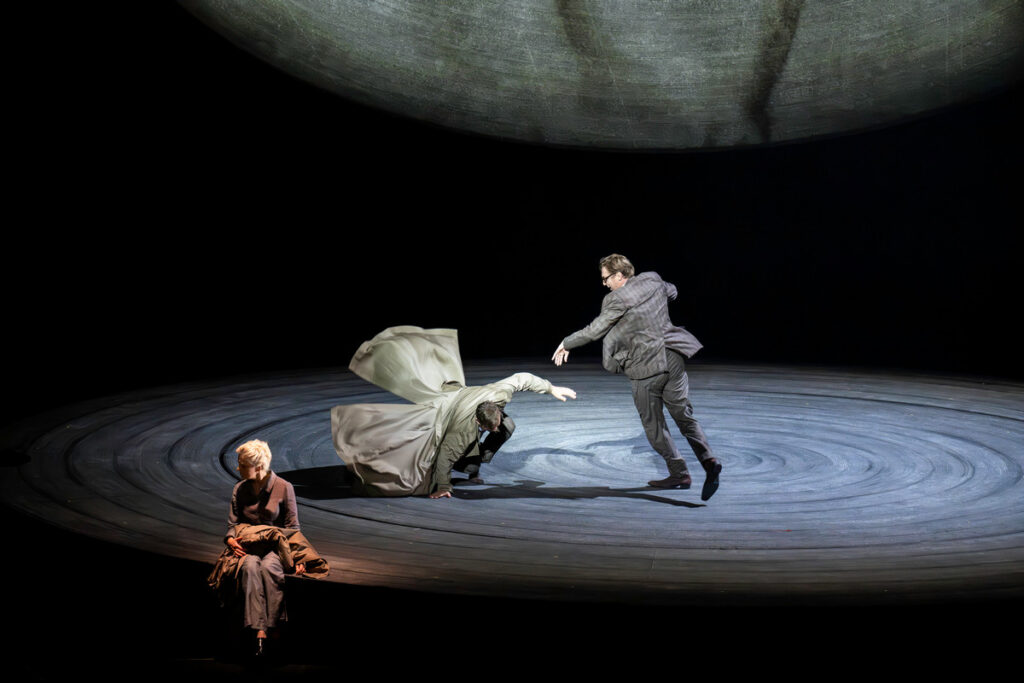 Režisérka Eva-Maria Höckmayr vytvořila moderní a na první pohled opulentní inscenaci, která se znalostí literární předlohy a jejích konotací všeho druhu cíleně počítá. Svět současný, minulý i fantazijní tu prezentuje v otevřené hloubce celého jeviště jako mlžné nekonečno, v jehož středu je výsuvná šikmá plocha s točnou (scéna a video Momme Hinrichs). Zejména monumentální sborové scény na ní působí vizuálně opravdu efektně a neztrácejí se tu ani sólisté v ústředních rolích. Mefistofeles se vyjímá ve svém obleku a béžovém balonovém plášti tak trochu jako ministerský úředník (kostýmy Julia Rösler), Faust v kabátě téhož střihu je jak jeho protějškem, tak alter egem. Není totiž zcela jasné, do jaké míry je to ďábel, kdo je režisérem Faustových osudů, a do jaké se Faust už od počátku jeho cynickým záměrům vymyká a směřuje ke zcela jinému druhu závěrečného poznání, než jaké pro něj Mefistofeles přichystal…