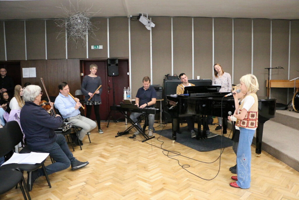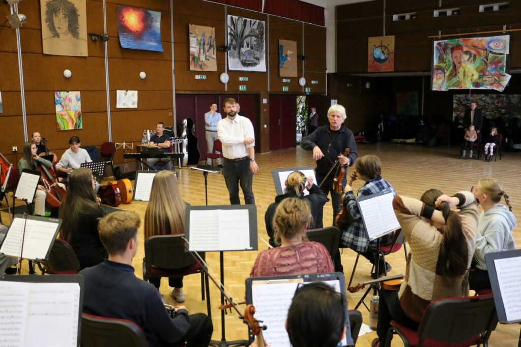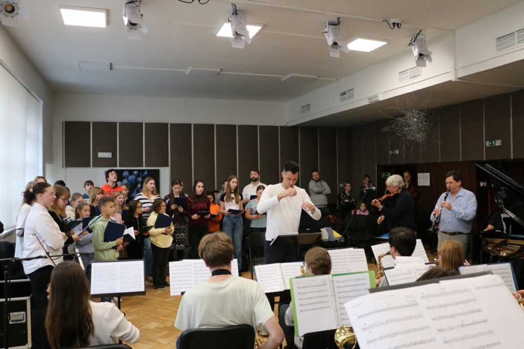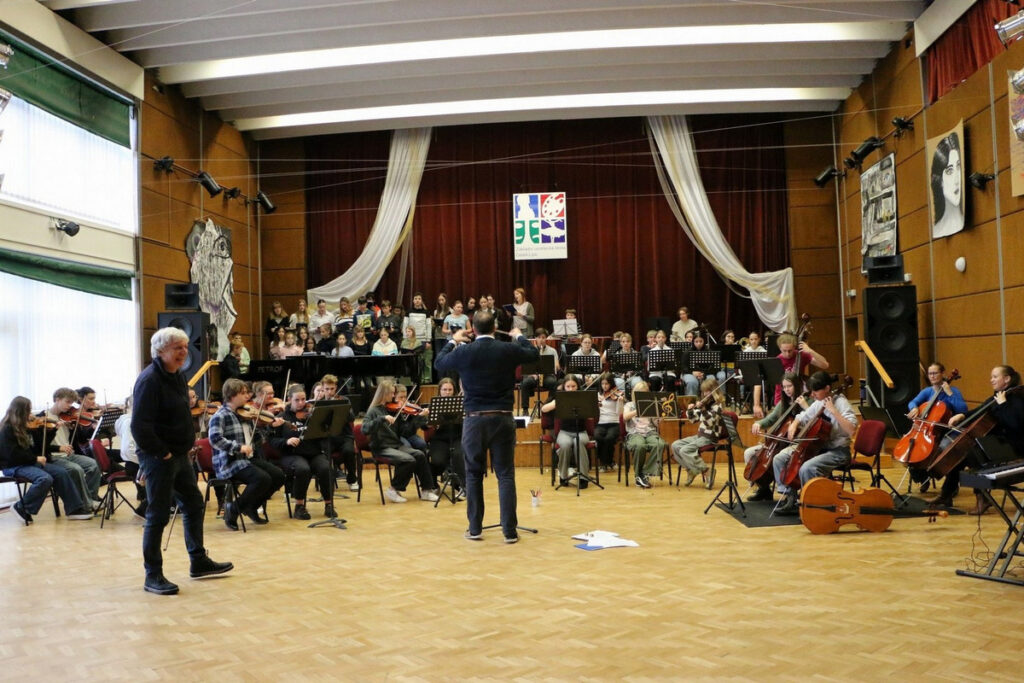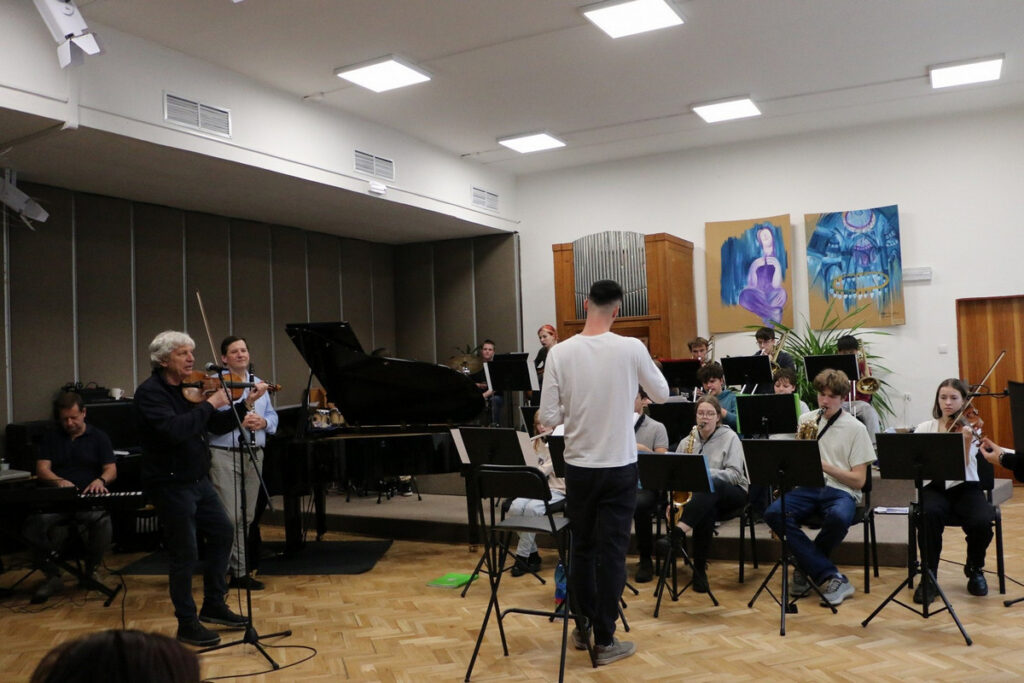 Přesouváme se do velkého sálu, kde se už chystá Komorní symfonický orchestr, zřetelně posílený pedagogy, zejména ve smyčcích. Pěvecký sbor tvoří spíše starší děti. Jan Ševčík je tentokrát v roli dirigenta.