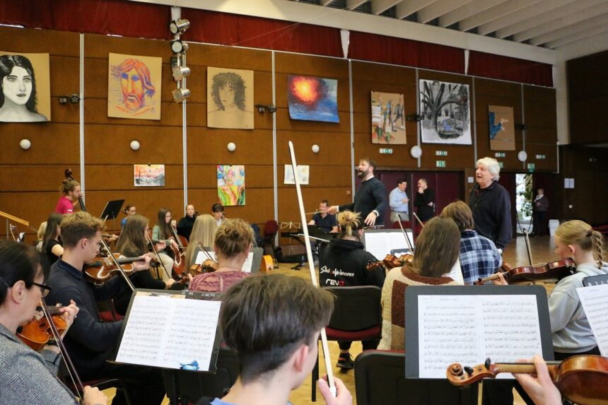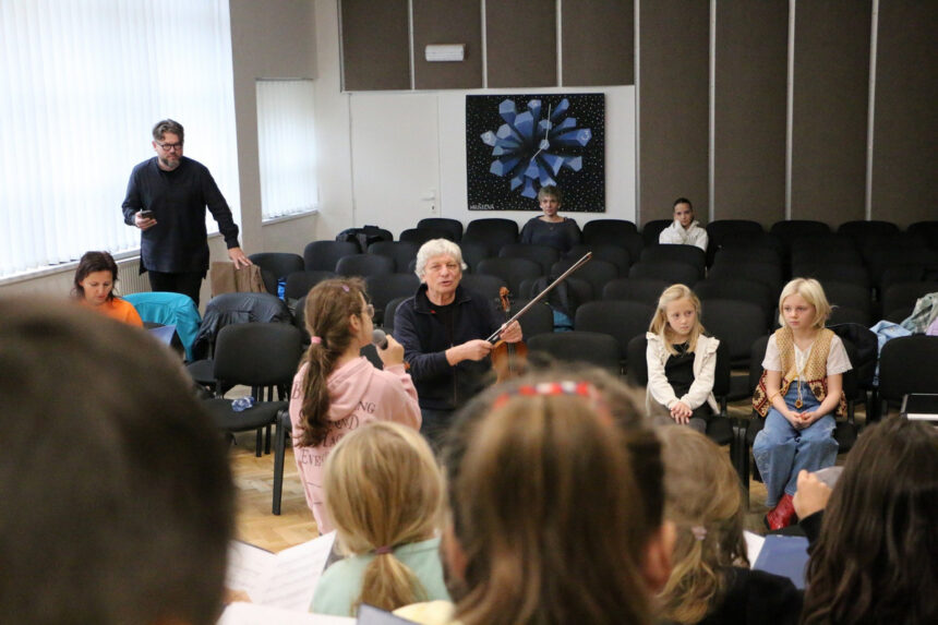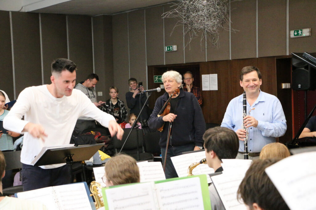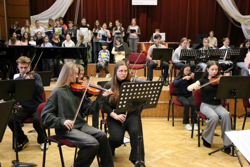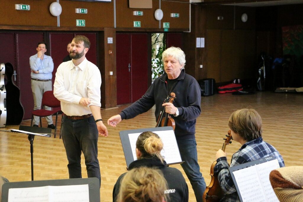 Přesouváme se do velkého sálu, kde se už chystá Komorní symfonický orchestr, zřetelně posílený pedagogy, zejména ve smyčcích. Pěvecký sbor tvoří spíše starší děti. Jan Ševčík je tentokrát v roli dirigenta.