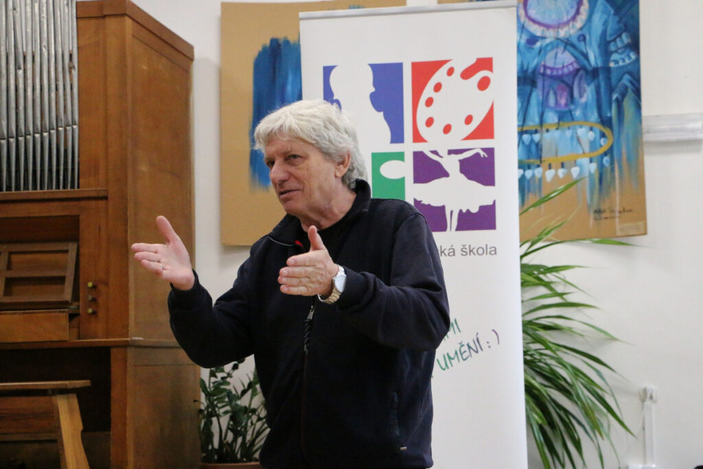12.13 Jiří Pavlica se ujímá slova a je stručný: „Pojďme zpívat! Já k tomu nic moc říkat nebudu. Jak víte, název tohoto projektu zní ‚Má to smysl!‘ Aby to mělo smysl, hudba nám všem musí dělat radost. A mimochodem – jsem tu letos poprvé, ale jak jsem zatím viděl, máte úžasnou a fantastickou ZUŠku, a jak jsem poznal, i skvělé učitele.“