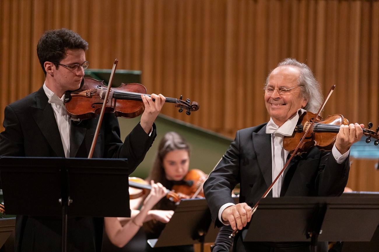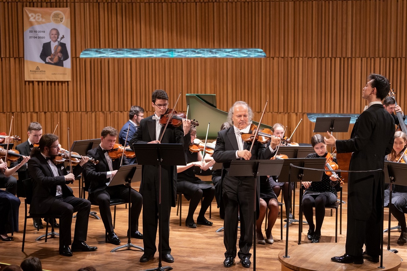 Připravili si pro nás Dvojkoncert pro dvoje housle, smyčce a continuo d moll Johanna Sebastiana Bacha. Koncert pochází z období Bachova pobytu v Köthenu, kde byl kapelníkem orchestru knížete Leopolda von Anhalt-Köthen. Bylo to jedno z mála jeho necírkevních angažmá a v Köthenu napsal značnou část svých orchestrálních a sekulárních děl. Jednak proto, že musel zajišťovat provoz kapely, a jednak z poměrně jednoduchého důvodu – neměl k dispozici varhany. Kníže Leopold hrál dobře na housle, ve své kapele si častokrát zahrál, a tak Bach v Köthenu pro housle hodně komponoval. Dvojkoncert není houslově mimořádně náročný. Pokud by si jeden part chtěl zahrát knížepán, tak na to musel brát Bach ohled, i když prameny uvádějí, že v Köthenu byli prvními interprety Joseph Spiess a Martin Friedrich Marcus. Smyčcový orchestr Pražské konzervatoře přišel doplnit cembalista, ale vzhledem k tomu, že cembalo bylo až za orchestrem, jeho krátký zvukový dosah byl kromě jedné části Allegra plně překryt zvukem houslí. Kouzelná byla druhá část Largo ma non tanto, kde oboje housle v táhlých pasážích přímo zpívaly. Kristian Mráček byl Václavu Hudečkovi snaživým partnerem. V úvodu Václav Hudeček vzpomínal na doby, kdy i oni, mimochodem s tatínkem Kristiana, seděli na židlích orchestru konzervatoře a – stejně jako současní hráči – hráli s ohromnou chutí. Soudě podle radosti, s jakou hrál svůj part v tomto dvojkoncertu, mu ta chuť i po létech zůstala.
