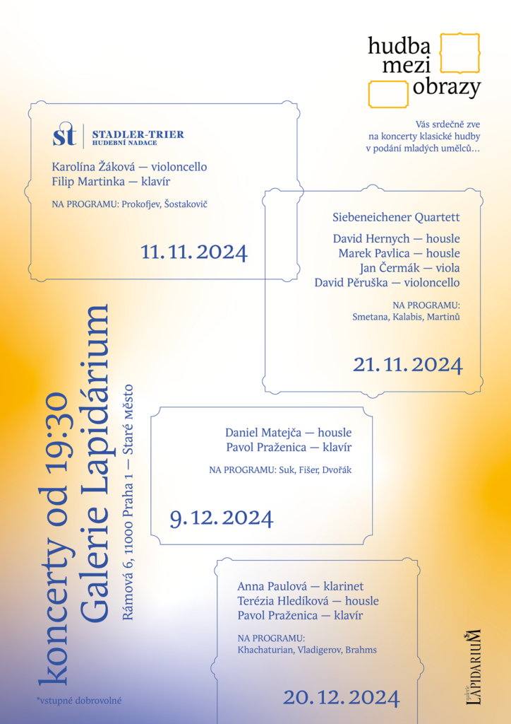 Studentský spolek Hudba mezi obrazy vzniklý na půdě pražské HAMU připravil na podzimní část sezóny čtyři koncerty. Ty se uskuteční v prostorách Galerie Lapidárium v Rámové ulici v centru Prahy a dají prostor mladým umělcům. Nejbližší vystoupení je na programu v pondělí 11. listopadu od půl osmé večer s violoncellistkou Karolínou Žákovou a klavíristou Filipem Martinkou.