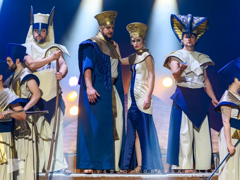 Biblické postavy vždy oplývají démoničností a zvýrazňují vážnost situace. Ideálním představitelem se ukázal být Martin Gurbaľ (alternuje Andrii Kharlamov) v roli Mojžíše, jehož sonorní bas plnil divadlo barevným kulatým tónem a jehož dominantní postava vévodila jevišti. Roli jeho bratra Eliezera (z Bible známe jen bratra Árona, který zde chybí) zpíval Ondřej Koplík (alternuje Raman Hasymau), jehož menší a úzký tenor se dobře nesl prostorem, ale vedle mohutného basu byl poněkud upozaděný. Výborný výkon podal představitel Amenofise, syna faraonova, Martin Šrejma (alternuje Martin Javorský). Jeho tenor zněl zpočátku měkce, až zastřeně, postupně nabíral na průbojnosti a gradoval do závěru s úderným znělým žesťovým témbrem. Důstojným a vyrovnaným protivníkem Mojžíšovým byl faraon v podání Daniela Kfelíře (alternuje Miloš Horák). Mladý pěvec dokázal být v roli barevný a úderný a ve vrcholových částech otevřel hlas do mohutné šíře decibelů, která podtrhovala i jeho démonickou postavu.