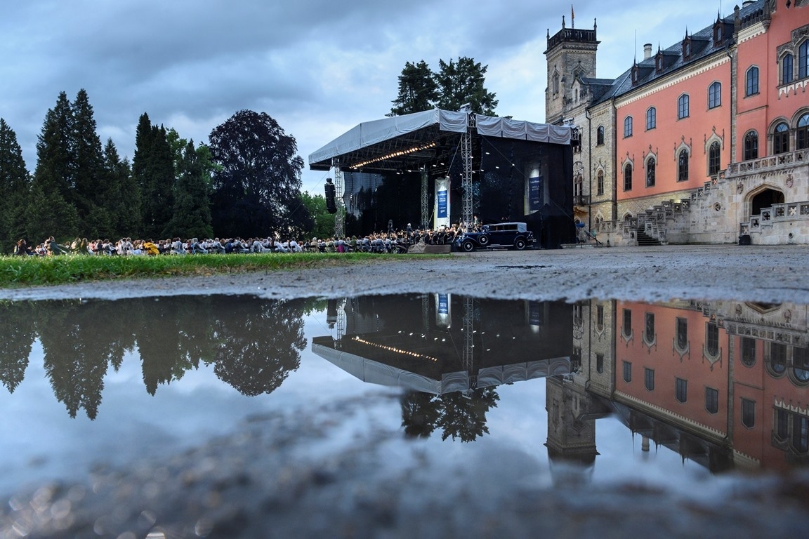 V zámeckém parku je kryté pódium, na filharmoniky v černém neprší, ale na publikum v pláštěnkách, sedící na židlích v zeleni, ano. Prší i na jeřáb s kamerou, která na obrazovky České televize a na sociální sítě přenáší působivé záběry přeletů nad auditoriem. Za pódiem je silueta novogotického zámku. Jezdíval sem po dvacet let Antonín Dvořák, a to na návštěvy za přítelem Aloisem Göblem, tajemníkem knížete Kamila z Rohanu. Naposledy tu byl v roce 1896, na jehož počátku v Praze dirigoval první koncert České filharmonie. Orchestr tu ve středu večer při svém open-air koncertu tedy není náhodou.