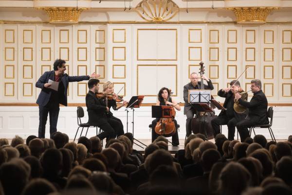 Soustřeďme se ale na neděli 29. ledna. Ten den se totiž na festival vrátili čeští umělci způsobem, jaký by si téměř zasloužil titulek „Český den na Mozartwoche“. Pokud jste dávali dobrý pozor při čtení úvodního historického přehledu, jistě vám neuniklo líčení zdejšího takřka triumfálního hostování hornisty a dirigenta Radka Baboráka v roce 2020. Jeho výsledkem bylo mimo jiné i navázání osobního přátelství s Rolandem Villazónem a pozvání na některý z příštích ročníků festivalu. Onen návrat se odehrál právě ve zmíněném datu, a to ve Velkém sále Mozartea v jedenáct hodin dopoledne. Takový čas si přímo říká o nějaké příjemné matiné před nedělním obědem. Právě takový program připravil publiku ve zcela zaplněném sále očekávaný umělec se svým Baborák Ensemble. „Mám velkou radost, že jsem tu po covidových časech opět s vámi“, pronesl před začátkem koncertu viditelně dojatý vedoucí souboru německy a odměnou mu byl první velký aplaus. Podobně frenetického ohlasu se pak dostalo houslistům Martině Bačové a Milanu Al-Ashabovi, violistovi Karlu Untermüllerovi, violoncellistce Haně Baborákové, kontrabasistovi Davidu Pavelkovi a samotnému hornistovi Radku Baborákovi po každém z hudebních čísel koncertu. Rámovaly ho koncerty Es dur KV 447 a KV 417 pro uvedené obsazení. Mezi oběma rozsáhlejšími kompletními kompozicemi pak zaznělo několik vybraných pasáží či fragmentů z dalších Mozartových děl (například Andantino grazioso ze Symfonie Es dur KV 132 v Baborákově vlastní úpravě pro jeho soubor). Baborák Ensemble odehrál koncert s naprostou interpretační brilancí a s jen zřídka slýchaným smyslem pro detail a vnitřní agogiku jednotlivých skladeb. Pozornému publiku se z Baborákových úst dostalo i výkladu o tom, jak se na lesním rohu vytvářejí některé tóny, které při předchozí skladbě vyvolaly nepřeslechnutelné veselí v sále. Nadhled a vtip byly vůbec tomuto koncertu vlastní, a tak nebylo divu, že se do něj krátce před koncem zapojil i přítomný talentovaný komik jménem Rolando Villazón. Během provedení fragmentu z Koncertu d dur KV 412 předčítal z Mozartova autografu vtipné poznámky, určené hornistovi Josefu Leutgebovi. Musím konstatovat, že slyšet hrát Baborák Ensemble a do toho poslouchat Villazóna, vydávajícího hlasitě povely typu „Tady to musí znít, jako když šplhá opice na strom“ byl zážitek, na jaký člověk v koncertní síni rozhodně jen tak nenarazí. Odměnou byly po koncertě „Baborákovcům“ dlouhotrvající a zcela zasloužené standing ovation. Nezbývá, než českým hudebníkům přát, aby se na Mozartwoche vraceli pravidelně. A pokud by se toto přání mělo řídit podle sympatií pana intendanta a ohlasů publika, vypadá to s jeho splněním více než slibně.