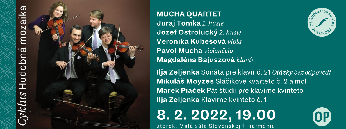 Malý sál Slovenské filharmonie bude v úterý 8. února od 19 hodin pařit souboru Mucha Quartet a klavíristce Magdaléně Bajuszové. Umělci zahrají díla tří slovenských skladatelů – Mikuláše Moyzese, Ilji Zeljenky a současníka Marka Piačeka. Koncert je zároveň dalším z řady akcí v rámci roku 2022 věnovaných devadesátému výročí Zeljenkova narození.