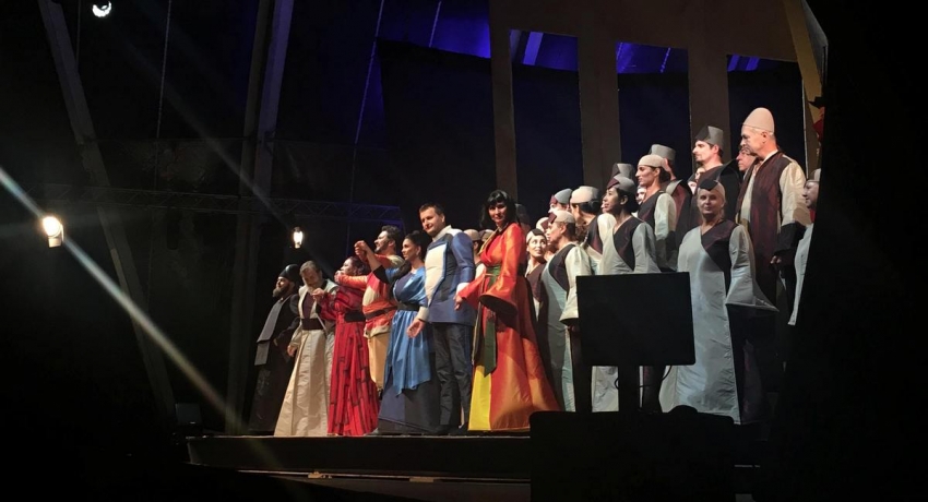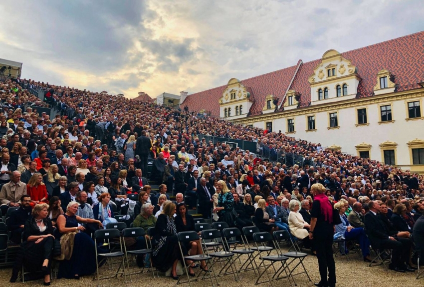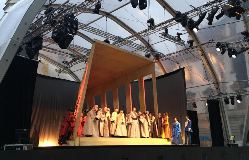 Ve čtvrtek při zkoušce pršelo, ale pátečnímu večernímu představení se déšť vyhnul. Soubor Státní opery, součást pražského Národního divadla, pak v bavorském Řezně v sobotu odehrál i druhé představení. Na Zámecké slavnosti na venkovní scénu s vyprodaným hledištěm pro tři tisíce diváků přivezl svou loňsku novou inscenaci Verdiho opery Nabucco.