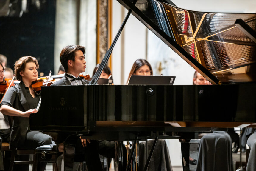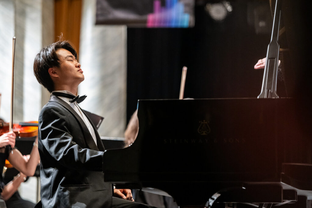Program večera porota dramaturgicky seřadila tak, aby spěl ke svému očekávanému vrcholu na konci klání. Prvním soutěžícím byl Kento Satsuma a představil se jako sólista v Koncertu pro klavír a orchestr č. 5 Es dur, op. 73, zvaném též „Císařský“. Beethoven jej napsal v r. 1809. Věnoval jej o osmnáct let mladšímu arcivévodovi Rudolfovi, kterého vyučoval hře na klavír. Dílo je pojaté z jeho koncertů nejvíce symfonicky, po introvertním Čtvrtém koncertu G dur následuje dílo přirovnávané k autorově symfonii Es dur Eroica z r. 1803, kterou Beethoven v r. 1809 dirigoval při francouzské okupaci Vídně. Bylo skvělou skutečností, že interpret tohoto koncertu je na Janáčkově akademii múzických umění zároveň studentem oboru dirigování. Z jeho výkonu tedy byl patrný obrovský nadhled nad formou díla i nad zvukovým obrazem, jehož byl součástí. Osobně mne velmi zaujal hned úvod koncertu, kde v sólových výstupech před zazněním hlavního tématu v orchestru hrál velmi kultivovaným tónem a nešel do autorem předepsaných nejvyšších dynamik, ale tyto si šetřil do nástupu reprízy první věty. V průběhu sólistovy hry se občas objevovaly technické kazy, ale tato skutečnost vycházela spíše z jeho poněkud zvláštního posedu u nástroje, kdy hrál spíše v záklonu, levou nohou se opíraje o pedálovou lyru, a u obtížnějších oktávových pasáží mimovolně zvedal ramena. Nicméně brilantní zvuk nástroje, který byl schopen dostat i při tomto posazení z plzeňského Steinwaye, který je spíše temnější barvy zvuku, byl obdivuhodný. A to i vzhledem k Satsumově celkovým tělesným proporcím, jelikož je poměrně subtilním mladým mužem… Orchestr Plzeňské filharmonie řídila zkušená dirigentka Miriam Němcová. První polovinu večera dirigovala bez taktovky. Skvělým způsobem v orchestru vyzněl třeba začátek druhé věty Adagio un poco moto, kdy zazněly v absolutní souhře pizzicata spodních smyčců a téma ve skupině vrchních smyčců. Rovněž začátek třetí věty Ronda, Allegra vyzněl díky pregnantnímu úhozu sólisty velmi zřetelně. V této větě se uchýlil Satsuma k hojnější pedalizaci, ale jeho úhoz způsobil, že hra zůstala srozumitelná.