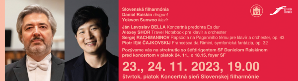 Slovenská filharmonie se představí v bratislavské Redutě pod taktovkou šéfdirigenta Daniela Raiskina opět ve čtvrtek a pátek 23. a 24. listopadu. Návštěvníci koncertů si vyslechnou program, se kterým se orchestr představí na již brzy startujícím turné v Jižní Koreji. Koncertní výjezd je ohraničen daty 26. listopadu a 4. prosince.