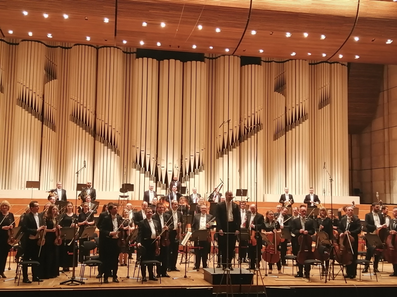 Ve Velkém koncertním studiu, jak zde nazývají hlavní prostor s mohutnými varhanami stojícími jako monolit nad jevištěm, mimochodem největšími na Slovensku, zazněl výběr tří sofistikovaných skladeb. Nejprve to byla St Paul’s Suite, op. 29 pro smyčce z roku 1913 od anglického skladatele Gustava Holsta, autora známých Planet. Suita je nesmírně zpěvná skladba, nabízející jak dojemné detaily, tak výpravný filmový zvuk v podobě širokých oblouků. Je vystavěna na čtyřech lidových písních a orchestr ji provedl nesmírně sdělně, ačkoliv v první, neoklasicistní větě mohla být souhra hráček a hráčů přece jenom o trochu větší (nutno zdůraznit, že dirigent Adam Sedlický nasadil od počátku rychlé tempo a s dynamikou nikterak nešetřil). Zaujala lehce znějící druhá i třetí věta, která poskytla skvěle vycizelované proměny nálad v podobě sténajících prvních houslí a neobvyklých exotických obratů orchestru v tutti. Příznivý dojem celé skladby orchestr dovršil v závěrečné části, kterou podal zeširoka a nesmírně výpravně a plnou dynamických proměn.