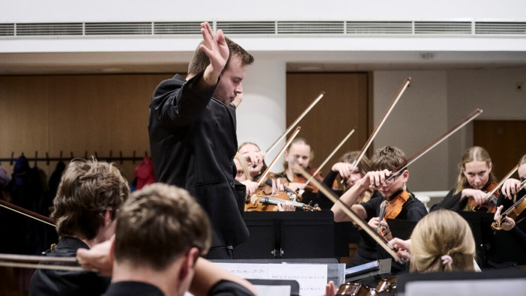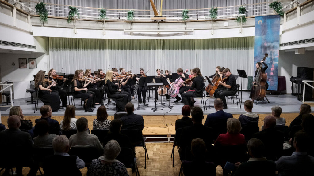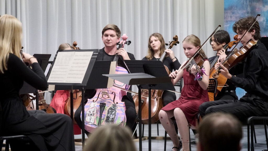 Pracovní program zabírá dětem i dospělým prakticky celý víkend, od pátečního odpoledne do nedělního podvečerního koncertu. Nahlížíme od sobotního rána: speciálně sestavený smyčcový orchestr, rozšířený o bicí nástroje, tvoří zhruba třicítka hráčů, přičemž dívky jsou v dvojnásobné převaze. Věk začíná na devíti, většině bychom odhadli čtrnáct. Ženskou část posiluje houslistka Eva Jamníková, avšak – světe, div se – u bicích. V orchestru usedl i Tomáš Jamník, a to s barevně malovaným violoncellem: „To je z Ševčíkovy akademie. Každý rok tam vyzdobíme jeden nástroj.“ Jiří Kabát řídí svoji skladbu Mikaelidagen, variace na švédskou melodii. Soudě podle ohlasů, v ZUŠ si ji rádi ponechají jako trvalý repertoár. „Vy už to všichni umíte, tak si to jednou zahrajeme a půjdeme domů,“ praví dirigent rozverně v úvodu zkoušky a mladí hráči se smějí – dobře vědí, že je čeká ještě dost práce. Ale na první poslech dětský orchestr vůbec nezní špatně: je evidentně připravený a obdivuhodně soustředěný – obvyklá představa o typicky roztěkaných puberťácích tu vůbec není na místě, hráči jsou spíš poněkud sevření, zejména zprvu.