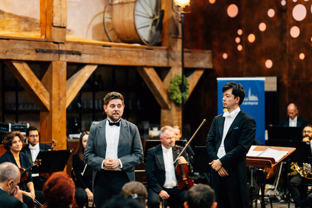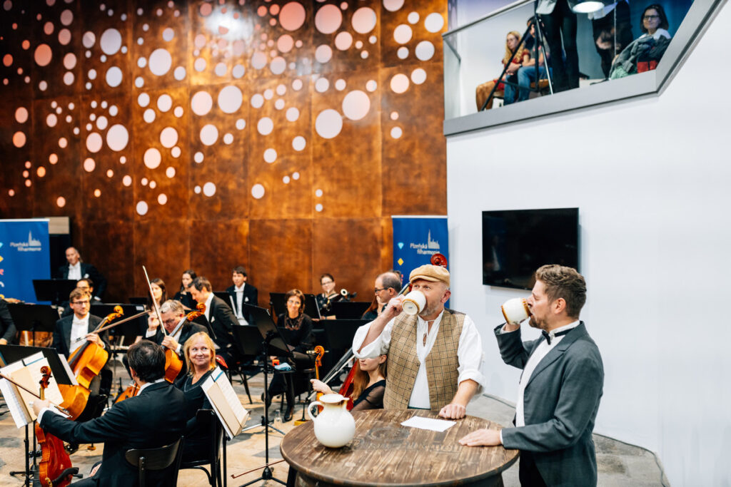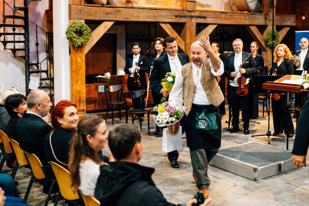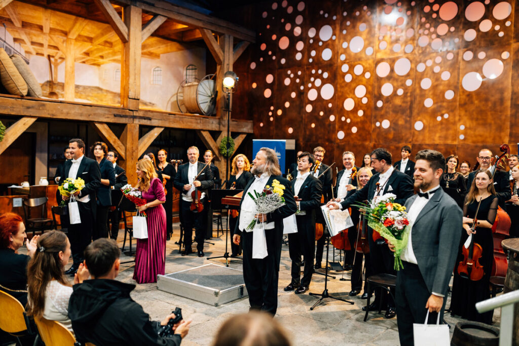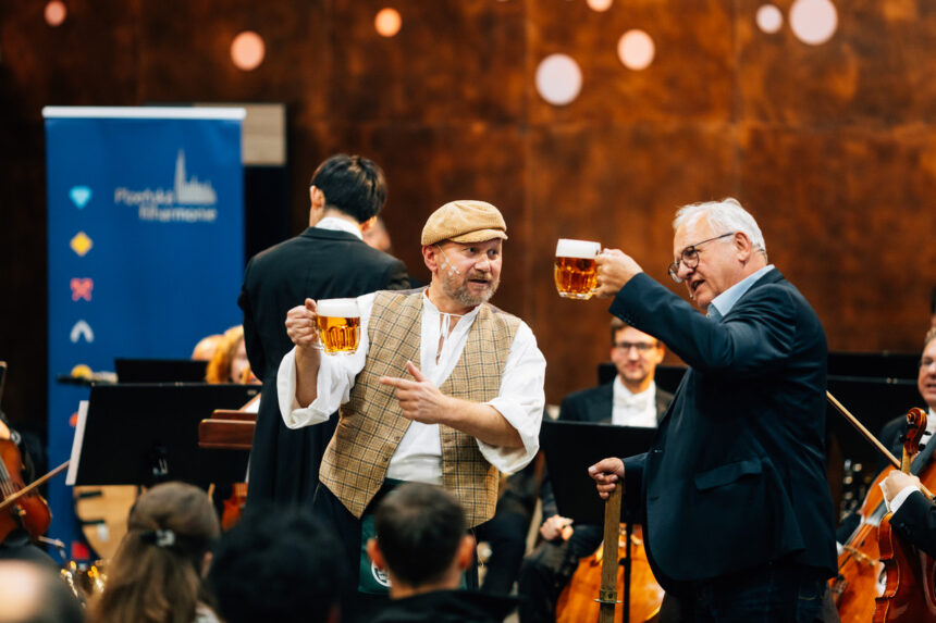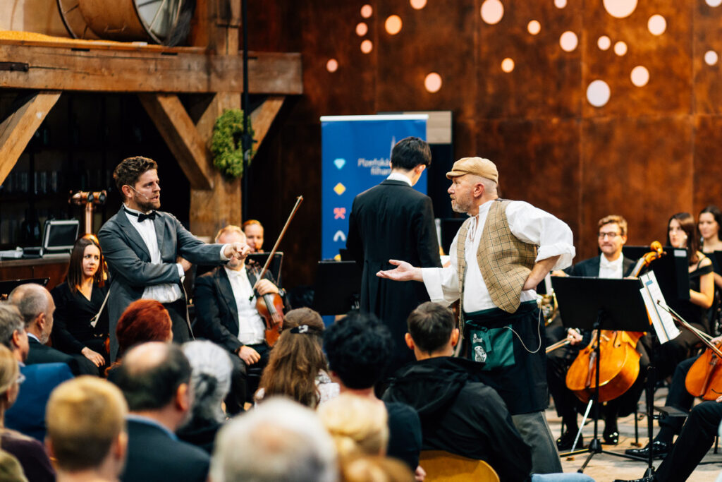 Zářijový termín koncertu měl tedy svoji symboliku, i když přesné datum říjnového založení várky a první konzumace vlastně o několik týdnů z povětrnostních důvodů předjímal. Všechny tyto informace si diváci připomněli díky průvodcům celého večera, herci Marku Mikuláškovi alias studentu Smetanovi a Martinu Pášmovi alias sládku Grollovi. Takto jsme byli svědky několika humorně laděných fiktivních rozhovorů, v nichž se Groll objevil jako Smetanův inspirátor (hudba budoucího skladatele by podle něj měla být sličná jako venkovanka, pivo musí chutnat jako hubička, musí mít pěnu podobnou smetaně…). Do těchto rozhovorů se posléze vmísil i starší sládek Plzeňského Prazdroje Václav Berka. Ten s sebou na ukázku přinesl tyč, pomocí níž se kdysi kontrolovala várka v kotli, a srovnal ji s dnešním přesným měřícím přístrojem. Dalším ukázkovým artefaktem byla kožená zástěra, kterou v místní restauraci Na Spilce podnes nosí výčepní jako záruku čistoty a dobře načepovaného piva.