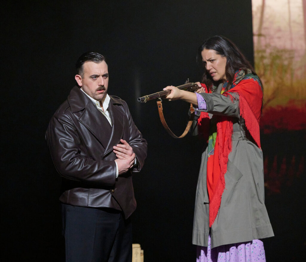 Dalším konfrontačním momentem bylo jednání postav na scéně. Ač ta překypovala současnými inscenačními prvky, z jednání zpěváků čišely manýry opery 19. století, kdy preference měl zpěv, zpěváci stáli na jednom místě a vztahy s ostatními postavami byly jen naznačené. Největší hereckou akcí bylo přecházení scény ze strany na stranu. Pro pěvce je to stav ideální, mohou se naplno věnovat pěvecké technice. V konfrontaci s moderními inscenačními prostředky je to ale pro diváka stav poněkud nekomfortní. U protagonistů to mohl být od režiséra záměr, což se těžko posuzuje. Ale v práci se sborem režie zcela zklamala, hromadné nekoordinované odchody ze scény, které zastavovaly spád představení, prozrazovaly malou jevištní zkušenost režiséra s tak velkou jevištní složkou.