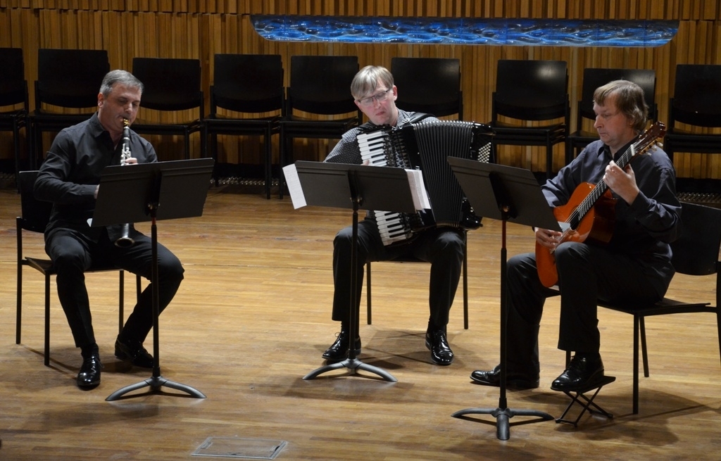 Na první pohled zvláštní a netradiční kombinace zmíněných tří nástrojů zněla díky muzikalitě a souhře muzikantů v ensemblu od začátku velmi příjemně. O entrée se postarala premiéra Impromptu pro klarinet in B, kytaru a akordeon. Nastínila ihned schopnost hráčů skvěle se na sebe nacítit. Chromatický motiv v akordeonu svým tepem podložil rozevlátější fráze klarinetu a kytary, které se tak trošku špičkovaly, ale nechaly vždy toho druhého dýchat. Skladba ve svých nádeších a výdeších působila výrazem i hudebním jazykem jako obrázek celkem klidného soužití dvou, sledovaných jakoby z ptačí perspektivy a podporovaných tahy akordeonisty.