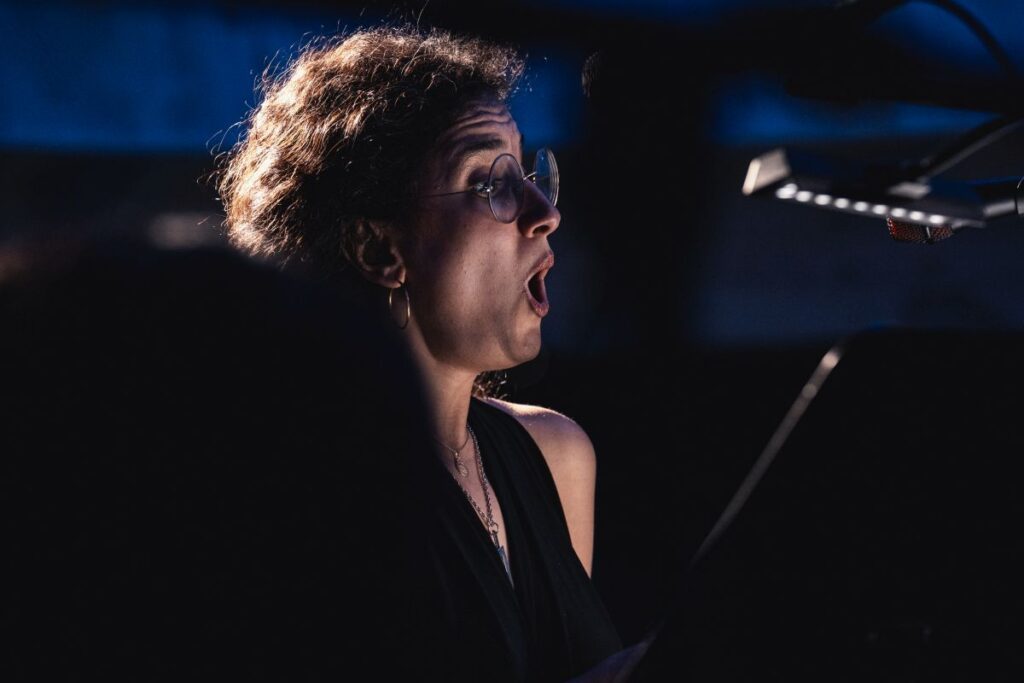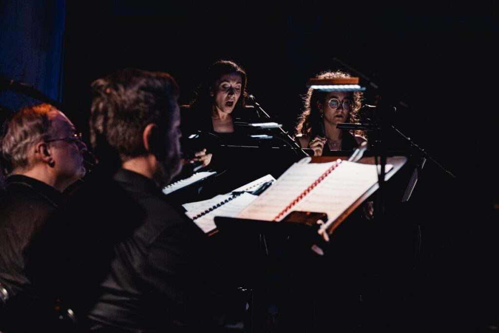 Asi najvýraznejšou zložkou ale zostáva tá vokálna. Už pre zbor, hlavne jeho ženskú časť, sú predpísané náročné polohy s vysokou tessiturou. Zvlášť v spojení s nízkou dynamikou a tým, že sa zvukovým ideálom stáva rovný tón, ide o náročnú úlohu. Canticum Ostrava podalo obdivuhodný výkon. Nevyhli sa im určité nepresnosti (napríklad v intonácii v zmienených náročných polohách), v rámci celku však pôsobili ako dostatočne nosný prvok. Kompaktnejšie znela mužská časť zboru, vzhľadom k povahe partov je to ale asi prirodzené. Zvláštnu pozornosť si potom zasluhujú obe sopranistky. Viac „stratosférických“ polôh – do g3 – mala v parte Maria Eleonora Caminada. Pozoruhodné bolo predovšetkým to, že aj v najvyšších držaných tónoch dokázala myslieť na dynamické nuanse, odlíšiť stupne piana či mieru vibrata. Part sa teda okrem iného stáva extrémnou etudou na prácu s dychom. Ľahko sa z toho stane karikatúra, Caminada aj Livia Rado ale ostávali sošné, odosobnené, mytologicky tajomné. Navyše sa k sebe dobre hodili aj farbou hlasu, Livia Rado bola miernym zjemnením.