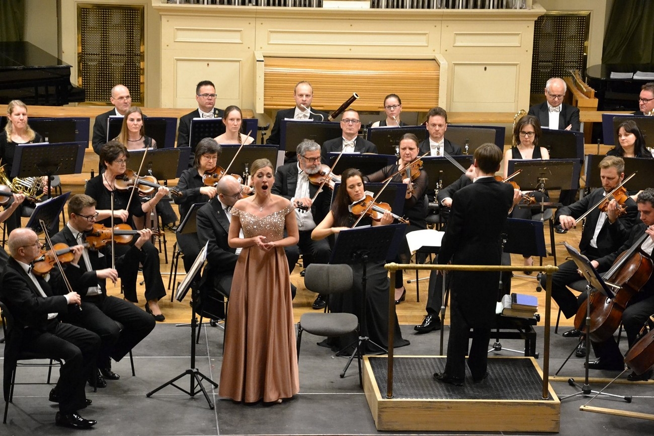 První polovina večera byla „zasvěcena“ českým operním skladatelům Bedřichu Smetanovi, Antonínu Dvořákovi a Leoši Janáčkovi. Na úvod zazněla předehra ze Smetanovy Hubičky. Orchestr Moravské filharmonie Olomouc ji nasadil v energicky svižném tempu a s plným slavnostním zvukem. Jejich hra však zároveň nepostrádala lehkost a šmrnc a to byl výstižný úvod ke všemu následujícímu – k hudbě plné energie, života a také vtipu. Po předehře se představila sólistka Jana Melíšková ve zpěvu dvou ukolébavek ze stejného díla „Hajej můj andílku“ a „Letěla bělounká holubička“. Obě propojené známé melodie zpívala ve velmi příjemném hlasovém zabarvení a citlivým nenuceným projevem, nijak transparentně, ale pouze s velkou přirozeností, krásnou výslovností a čistou intonací. Své příjemné vystoupení zakončila milým gestem, když sklonila hlavu jakoby v usnutí na opěradlo židle.