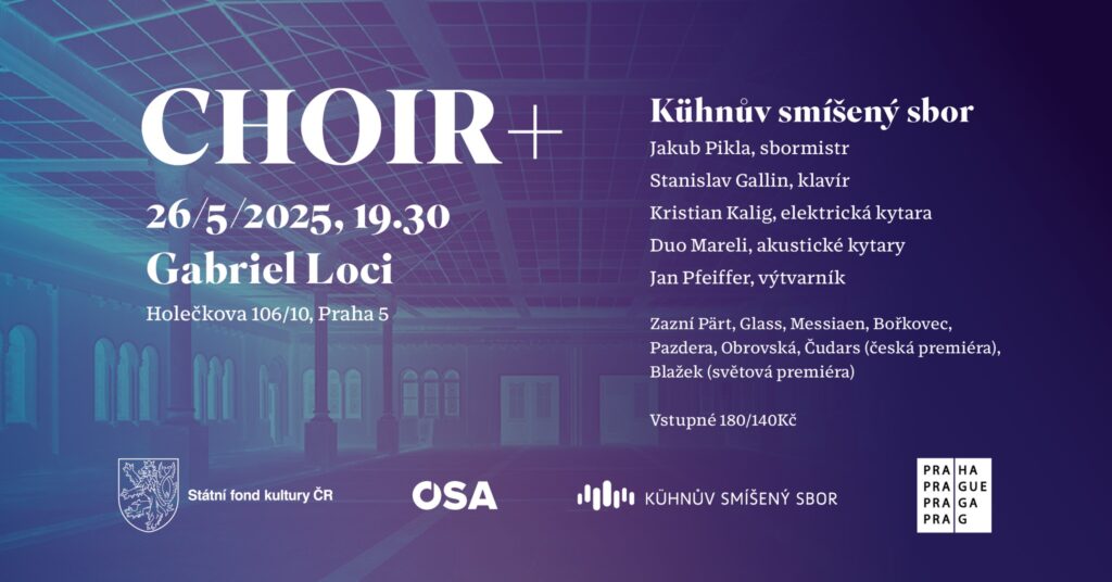 Na programu připraveném pro neobvyklý koncertní prostor Gabriel Loci v Praze na Smíchově bude znít sborová tvorba Arvo Pärta, Philipa Glasse, Pavla Bořkovce, Matīsse Čudarse a zazní světová premiéra skladby mladého autora Nathana Blažka. Kytarové Duo Mareli provede skladby Jany Obrovské a Ladislava Pazdery. Hudební minimalismus, světelné projekce a světové premiéry skladeb českých i zahraničních autorů si kladou za cíl zážitek pro všechny smysly. „V projektu CHOIR+ ukazujeme, že sborový zpěv je víc než jen hudba – je to výzva a dialog, který nachází svého partnera nejen v doprovodu hudebních nástrojů, ale také v dalších uměleckých disciplínách,“ říká dramaturgyně projektu Eva Velická. Sbormistr Jakub Pikla zdůrazňuje unikátnost tohoto formátu: „Práce na projektu CHOIR+ je pro nás pro všechny velkou výzvou – pro mě osobně je to nastudování klasického koncertního repertoáru v tak úzkém propojení s vizuálním uměním. Pro zpěváky je to provozování hudby, která tak často na koncertních pódiích nezaznívá. Kromě toho chceme vyzkoušet i netradiční rozmístění sboru tak, aby měl posluchač doslova stereo-zážitek. Například hudba Arvo Pärta k takovému pojetí přímo vybízí.“ Koncert CHOIR+ se koná dne 26. května v sále Rajská zahrada komplexu Gabriel Loci (Holečkova ulice na Praze 5).